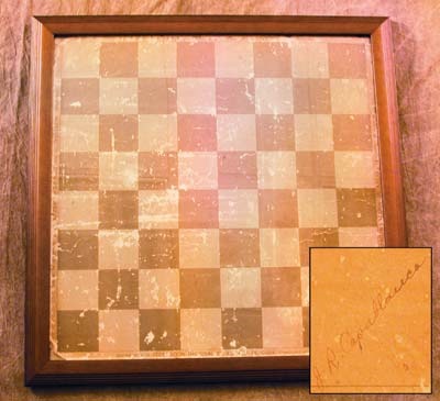 The ultimate signed piece of one of the greatest chess champions ever. Chessboard used by Capablanca at a match in Cuba and then signed and given to a chess fan right on the spot! He has signed it in one of the corners in NRMT ink "J.R. Capablanca." Board is Good. Nicely framed on the diagonal, overall 23x23".