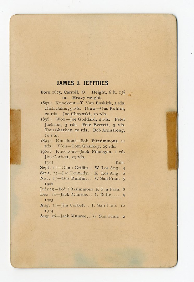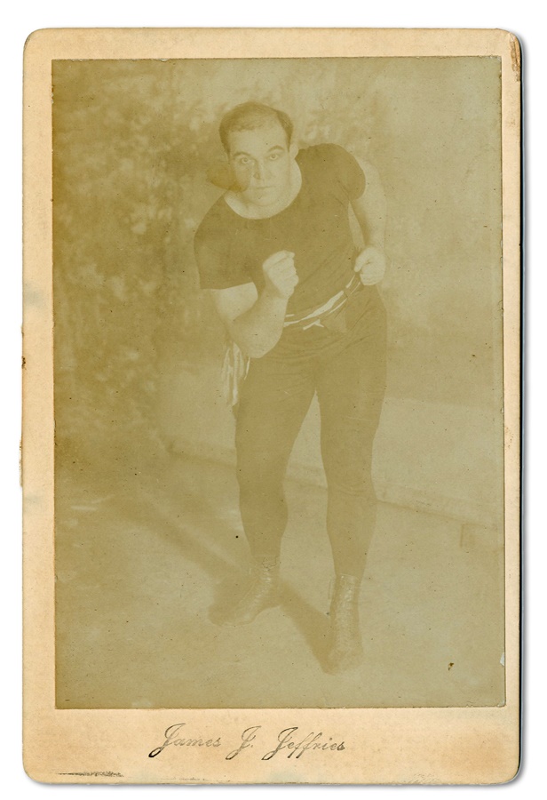 This photo highlights James J. Jeffries, a world heavyweight boxing champion around the turn of the 20th century. The photo is from circa 1910, when Jeffries was making his comeback following his retirement six years prior. The photo is faded and has scarce tape stains on the back, but is otherwise EX. Measures 7x4.5".