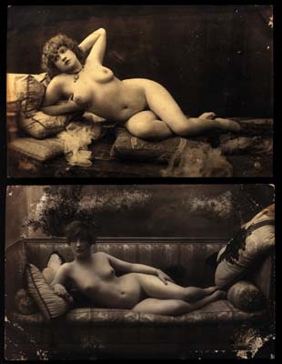 1) A dazzling collection of ninety-two mostly blank backed postcards of French nudes from the 1920's. All are real photos and magnificent. 2) Five 1920's Cuban ciga-rette cards uncut sheets of nudes of the period. Advertisers include Gener and Trinidad Y Hno. Each are about 8x10" with a total of 95 cards. 3) Eleven Cuban nude tobacco premiums from ciga-rette makers of the 1920's. Overall VG-EX.