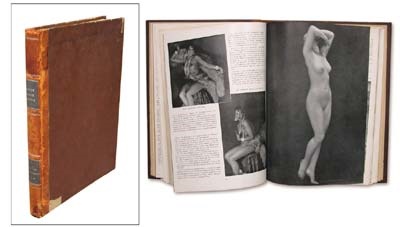 This magnificently bounded volume of this French erotic magazine is one of the finest quality mags of any kind you may ever see. There are fourteen issues here and multiple gorgeous tipped-in full color prints of art deco nudes by top illustrators including Mucha. Content includes severe sub-ject matter with light S&M, chastity belts, photos of Josephine Baker and even "Special Issues" like Follies-Bergere. The collection is beautifully bound in leather (what else?). Magazines are NRMT (one page missing but the print is there) o/w NRMT. Volume itself is VG-EX. 15x11".