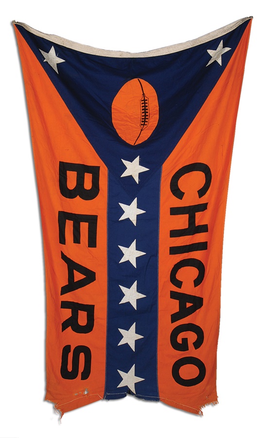 This terrific cloth pennant flew for more than 20 years over Wrigley Field, where the Chicago Bears called home prior to taking up residence in Soldier Field in 1971. Three years prior, this 77x46" flag was presented to the USS Parle DE708 U.S. Navy ship, which was used to train reserves on the Great Lakes., The navy and orange Bears colors are particularly vibrant, and the World War II era stars add to its splendor. There are some small holes, rips and some fraying on the right edge, but is otherwise in EX condition. This one has both military and football history in its background, and you can't get more American than that! Comes with LOA.