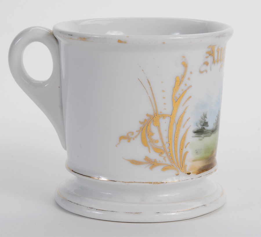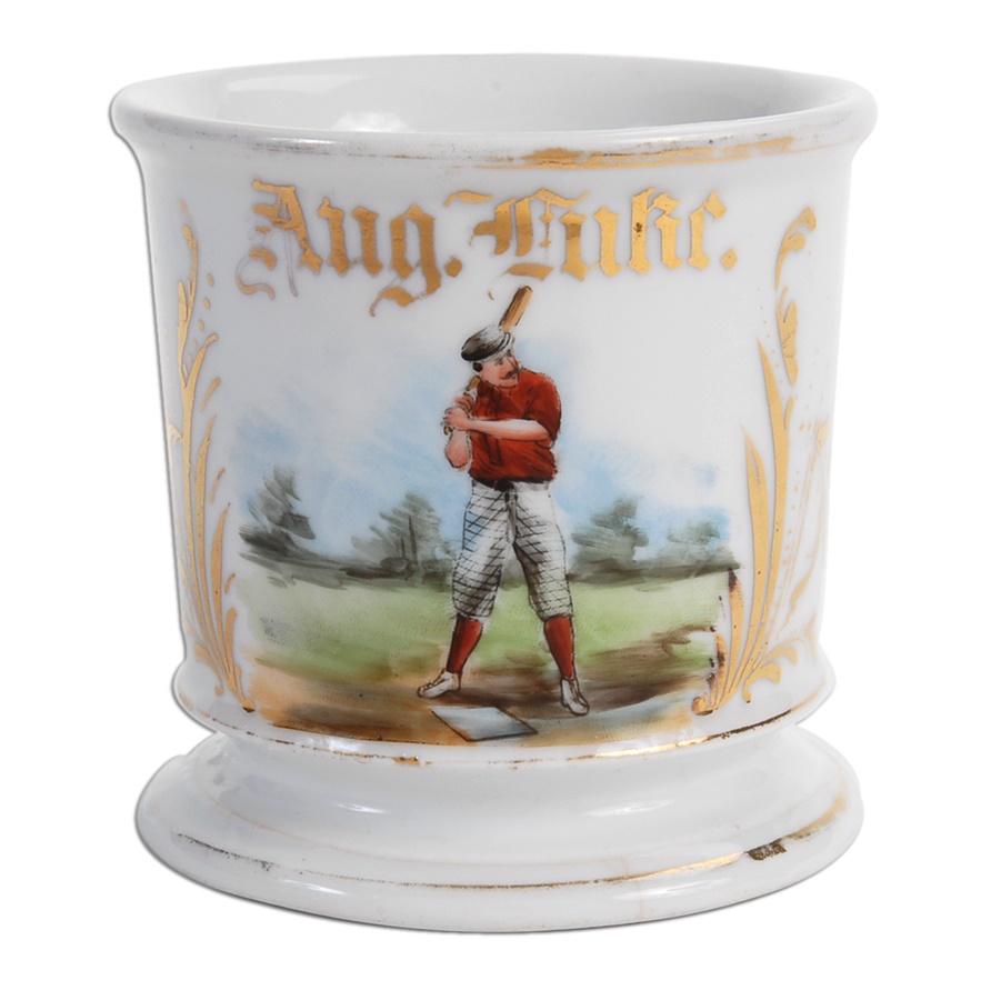Shaving mugs were used extensively at the turn of the 20th century in barber shops across America. They held a cake of soap that was worked up into a rich lather with a bristle brush at a time when it was commonplace for men to visit barber shops for a close straight razor shave. In many barber shops, a fitted shelf held spots for the personalized mugs of its patrons. These mugs usually had the customer's name, and a hand painted illustration of the man's occupation. This is one of the finest baseball examples that we have seen. The name "Aug Fuhr" appears in gold leaf lettering. Incredible hand-painted scene of a batter at the plate appears below the name. The mug itself has no chips or cracks. The scene of the baseball batter is NRMT.