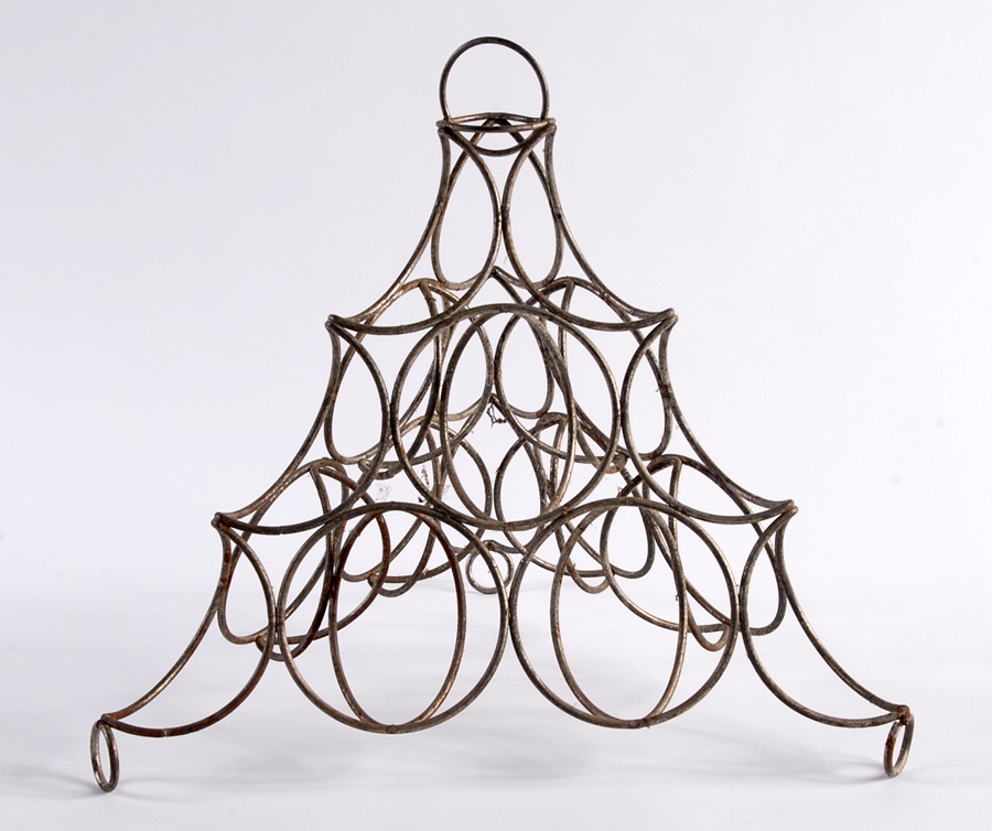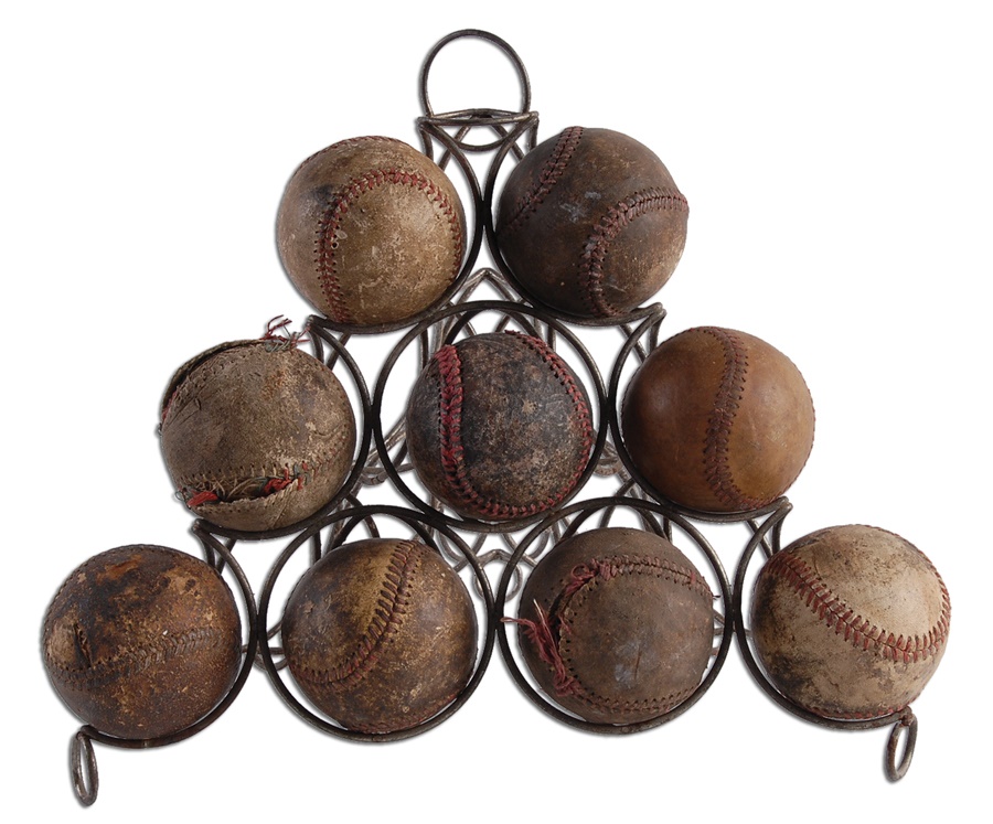 Simultaneously decorative and functional, this metal display rack sat on the counter at a sporting goods shop and was used to promote the sales of baseballs. Nine used, vintage balls are included in the lot, which can actually hold twice as many. This hails from the first quarter of the 20th century and is a nifty piece of Americana.