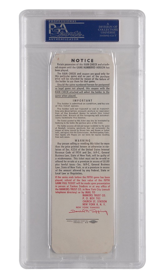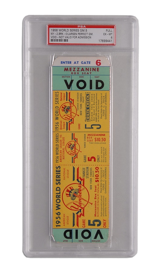 There have only been 20 perfect games in the long, rich history of baseball, and only ONE in the postseason. Don Larsen's gem made headlines during the 1956 World Series as it was the crowning jewel in the Yankees' triumph over the archrival Brooklyn Dodgers. This full, unused ticket has "VOID" printed on it and was a proof ticket but identical to those issued for the game (but for the "VOID" and absence of seat numbers). It is encapsulated, graded PSA 6 and in EX-MT condition. Larsen's perfecto came during Game 5 of the Fall Classic on October 8, 1956 before 64,219 electrified fans in the Bronx. It took the San Diego native just 97 pitches and just over two hours to retire the 27 batters to face him, including pinch-hitter Dale Mitchell, who whiffed for the final out, prompting catcher Yogi Berra to pump his fist, leap up and jump into Larsen's arms.