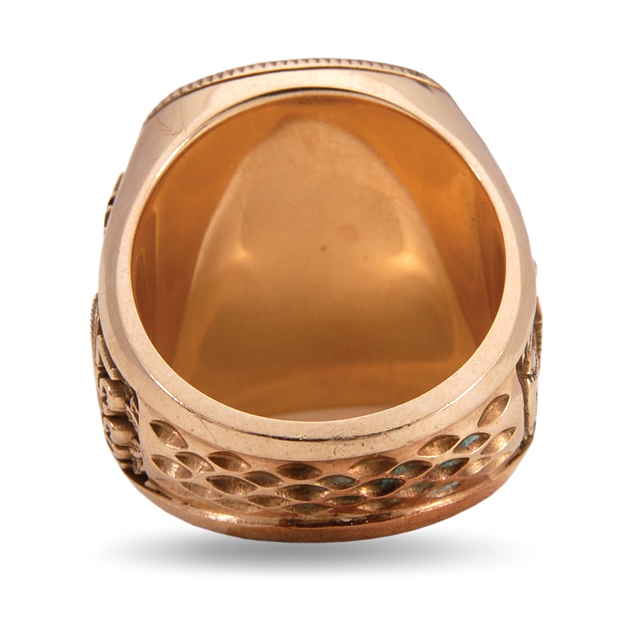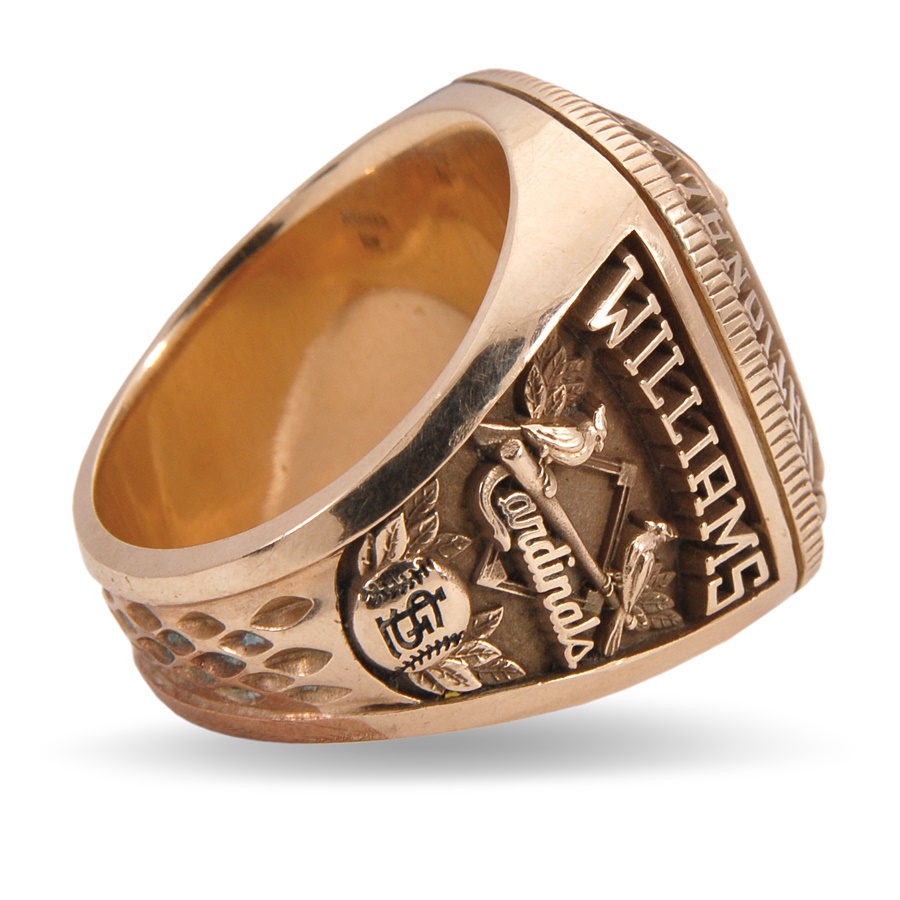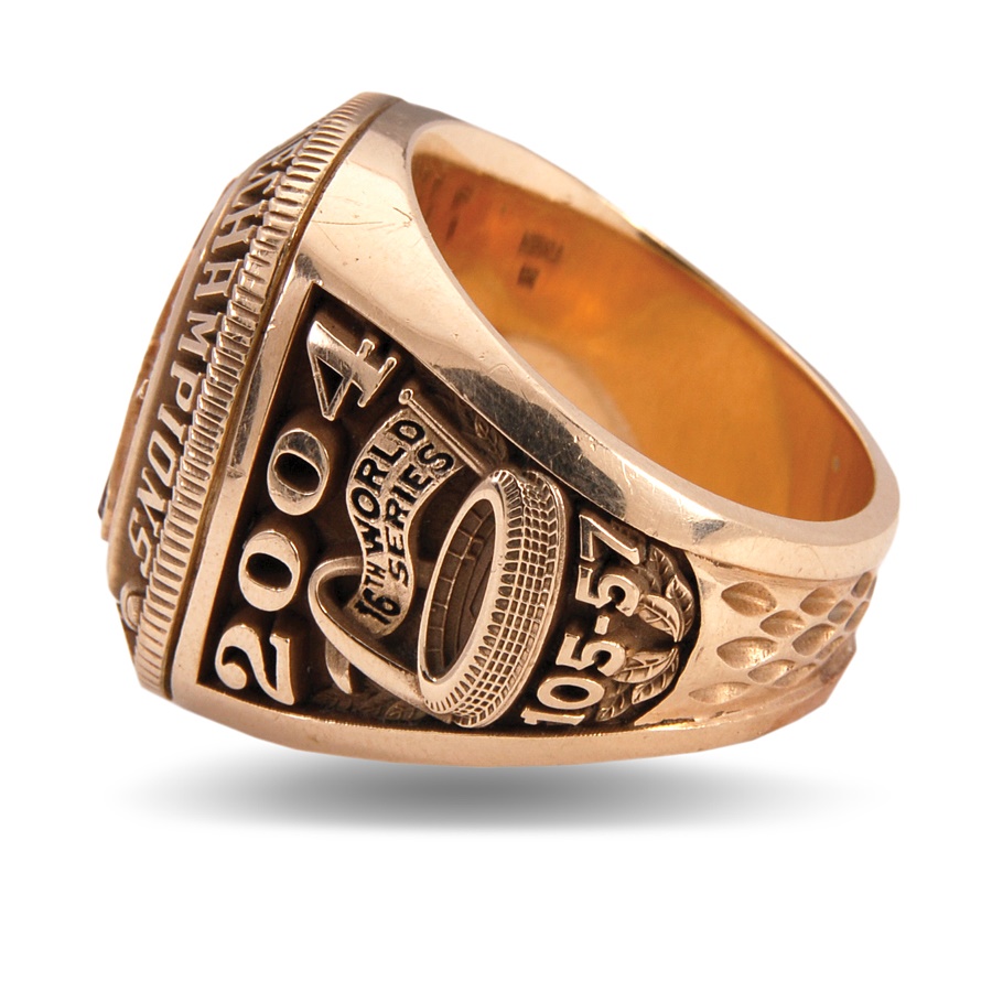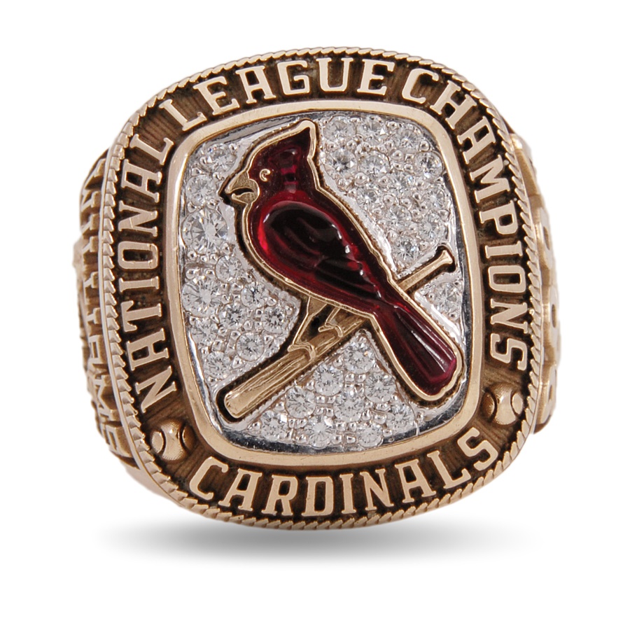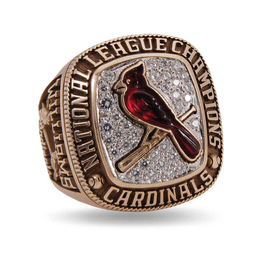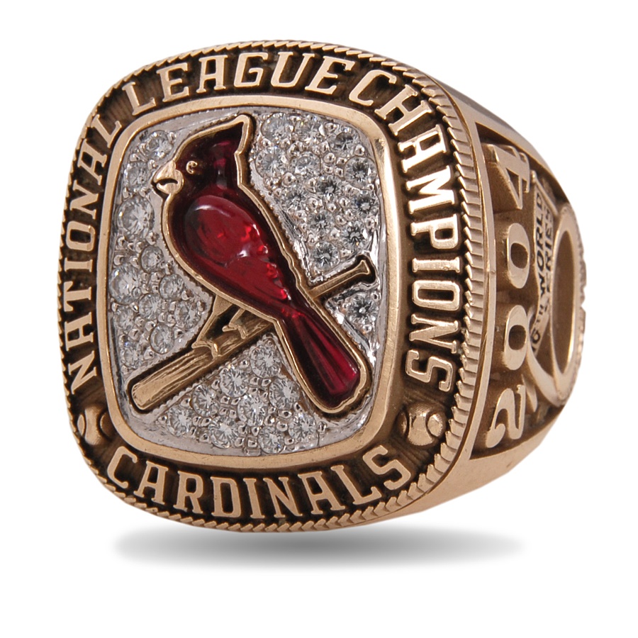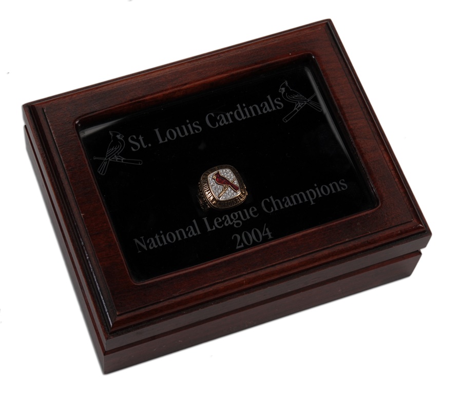 The St. Louis Cardinals won their unprecedented 16th National League pennant in 2004 before falling to Boston in the World Series. This substantial ring, featuring real diamonds on the top and stamped "INTERGOLD 10K" inside, belonged to a Cardinals employee. The wording across the face reads: "NATIONAL LEAGUE CHAMPIONS CARDINALS," while the side panels read: "WILLIAMS" and "2004 16TH WORLD SERIES" and "105-57." The ring is in NRMT condition, is size 12 1/2 and comes with the original presentational box. Weighs approx. 45 grams.