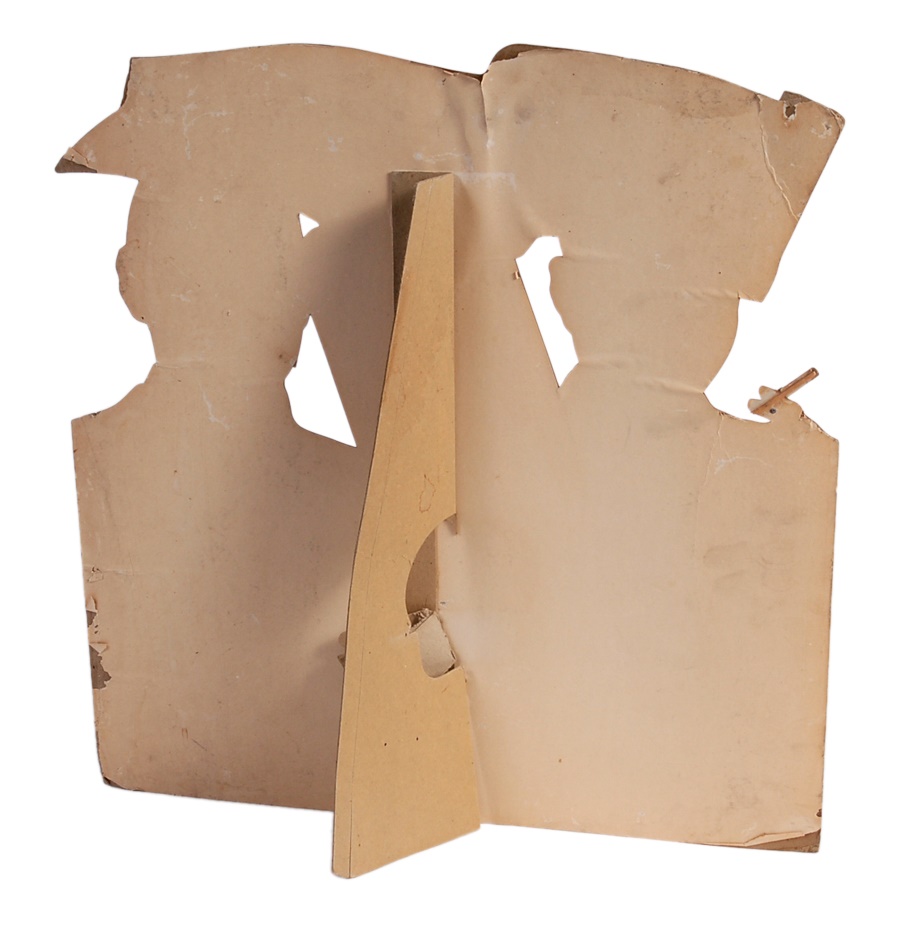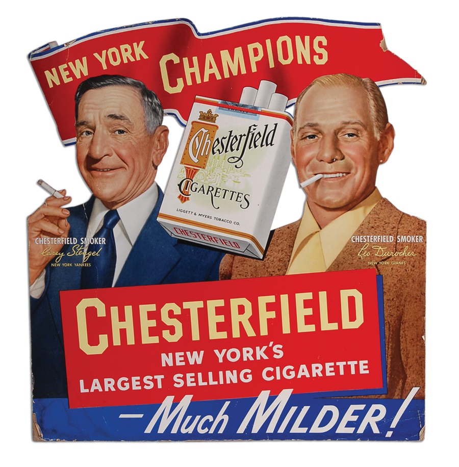 Smoke 'em if you got 'em! A unique, asymmetrical cardboard advertising display with an aisle on the back, this clear and colorful ad measures roughly 20x21" and dates from the early 1950s. Hall of Fame New York City baseball managers Casey Stengel and Leo "The Lip" Durocher are shown smoking cigarettes (imagine that today!) with their autographs displayed under the header: CHESTERFIELD SMOKER. It's a little rough around the edges but still grades Good to Very Good and has a nice retro appearance.