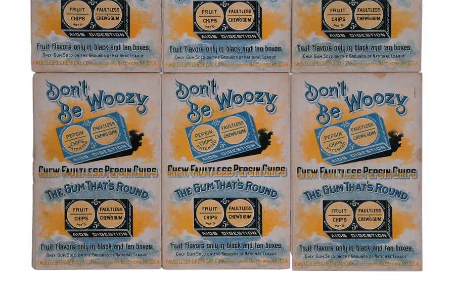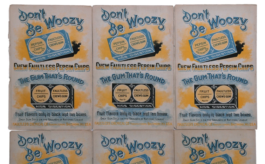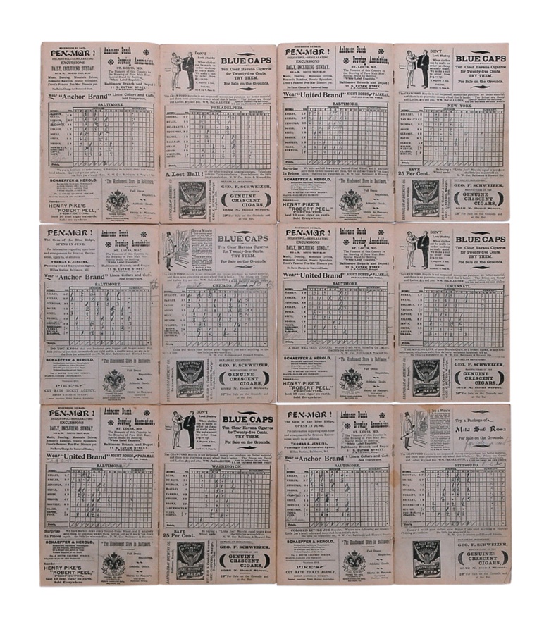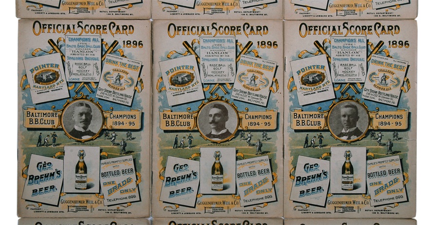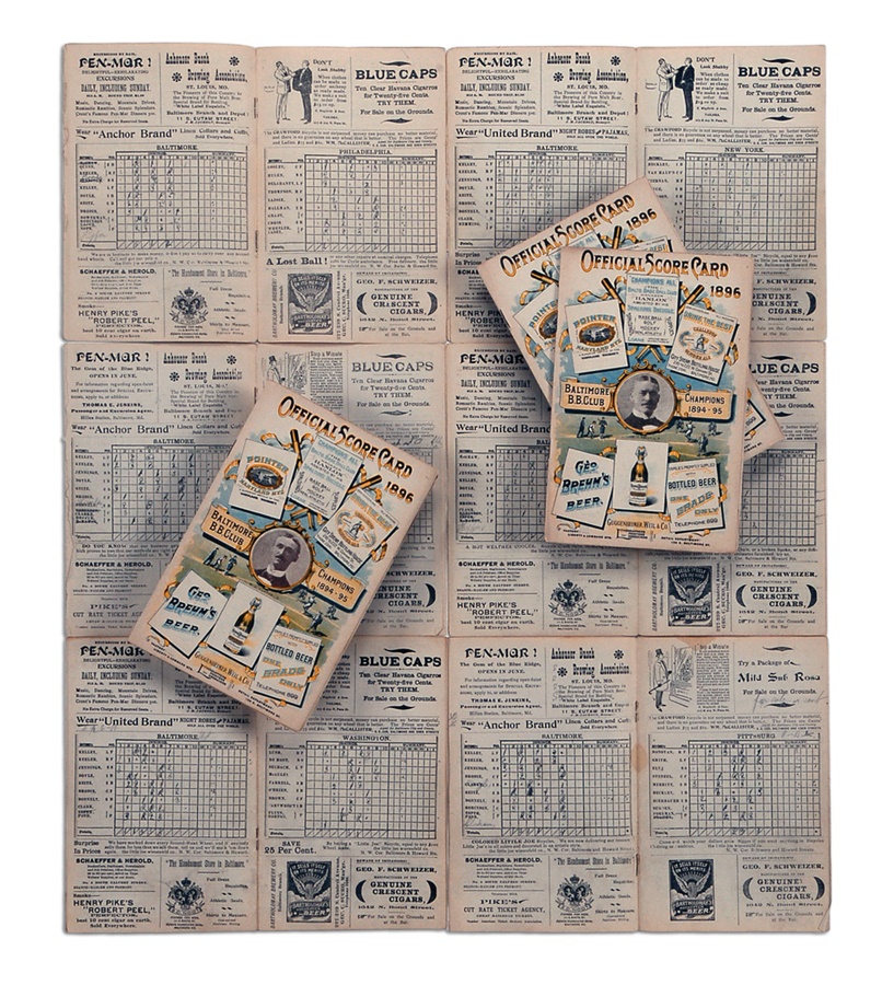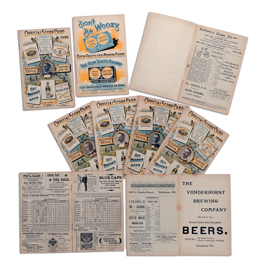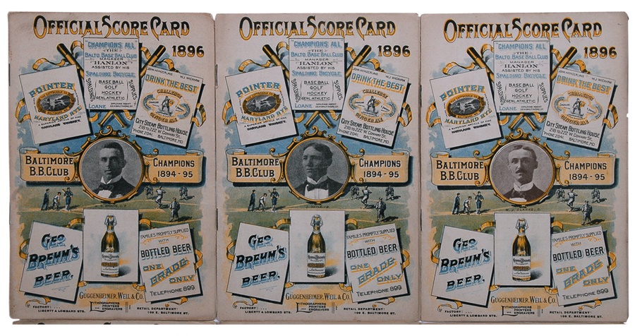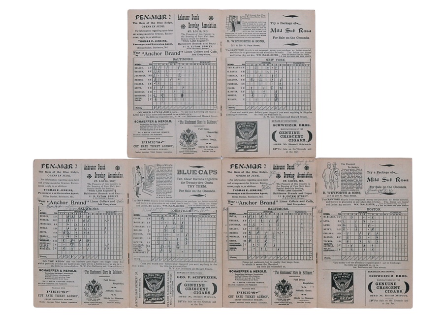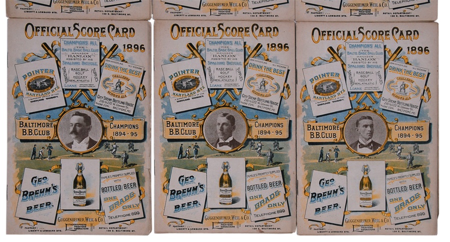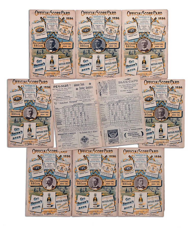 If there is a better grouping of these known to exist, we are not aware of them. Each one has a different player pictured on the front; specifically Steve Brodie, Jack Doyle, George Hemming, Bill Clarke, Sadie McMahon, Joe Kelly, Arlie Pond, Bill Hoffer and manager Ned Hanlon, who led the Orioles to a Major League-best 90-39-3 record in 1896. These beautifully colored 6x9" scorebooks are in very pleasing condition, mostly VG-EX. All are scored in pencil and feature opposing teams such as the New York Giants, Washington Nationals, Pittsburg Pirates (during the window when the city dropped the "h" from the city name), Cincinnati Reds, Louisville Colonels, Chicago Colts, Boston Beaneaters and Philadelphia Phillies, which boasted Hall of Famer Ed Delahanty, who led the National League in homers, RBI and doubles that season. Vintage ads throughout the books lift this lot to even loftier heights. A collector's heaven!