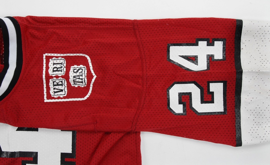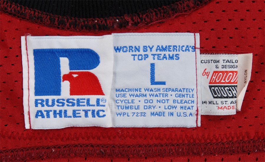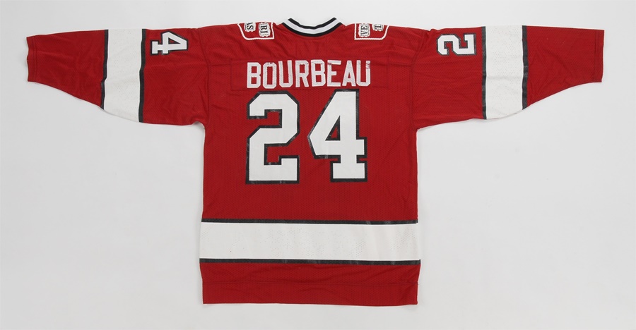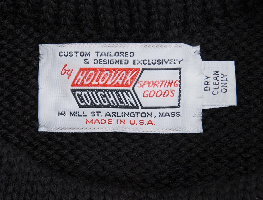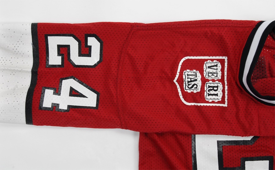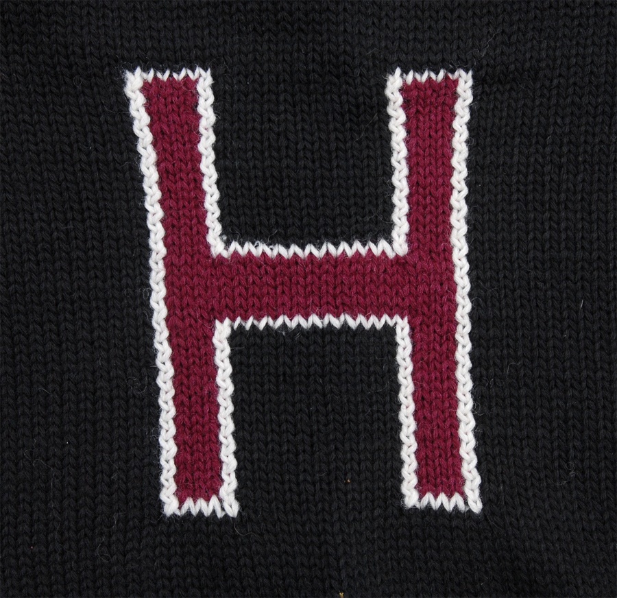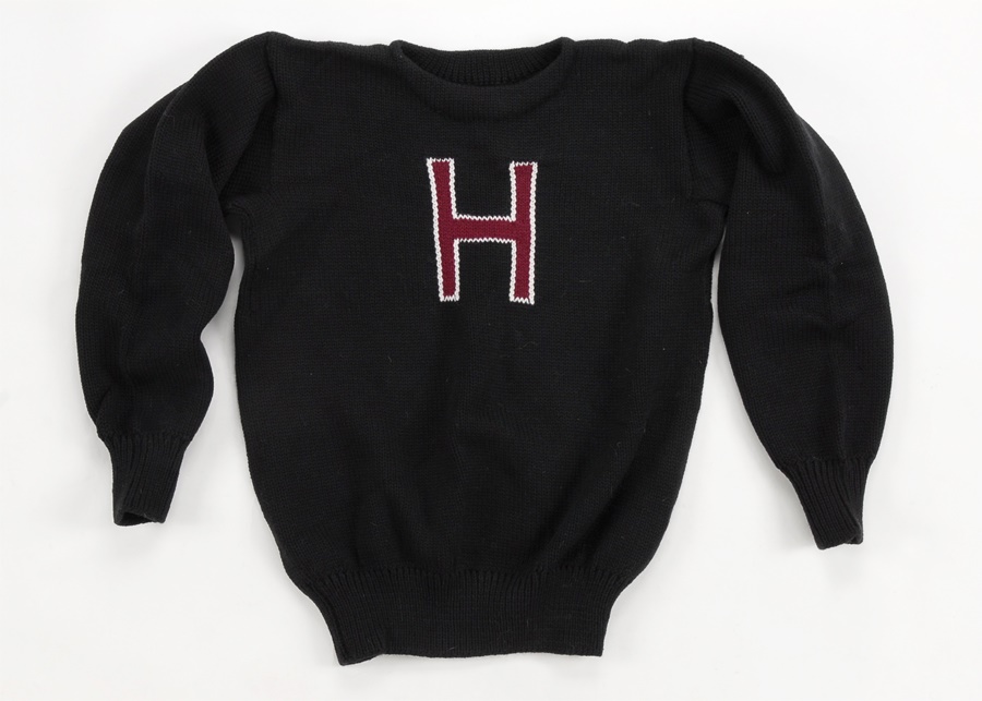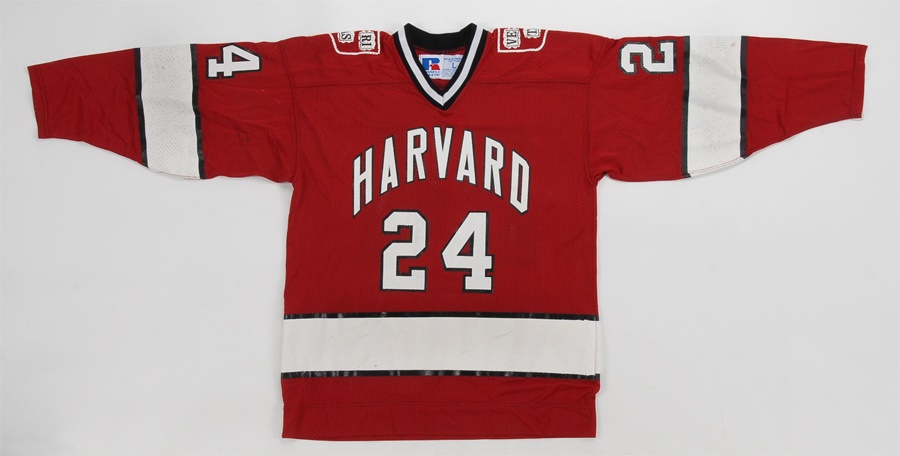 Before joining the Harvard Crimson, Allen Bourbeau was drafted by the Philadelphia Flyers in 1983 and played in the 1984 World Junior Championships. After he donned this pair of Harvard University relics, Bourbeau represented the United States at the 1988 Calgary Olympics. Included in this lot is the crimson game jersey worn by Bourbeau at Harvard. Russell Athletic size Large and Holovak Coughlin Sporting Goods tags in the collar. The front has the school name across the above his uniform number 24. The back has “Bourbeau” screened onto a nameplate above the numbers. All letters and numbers are screened. Some paint transfers and stick marks throughout the sleeves and body. Also included is his Harvard letter sweater, all black save for the
