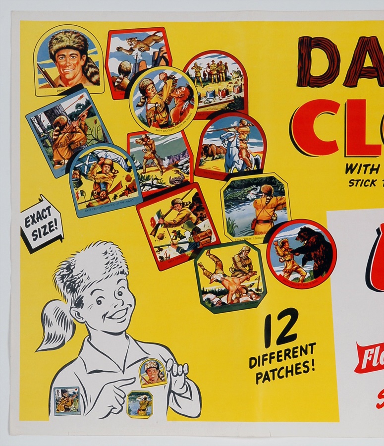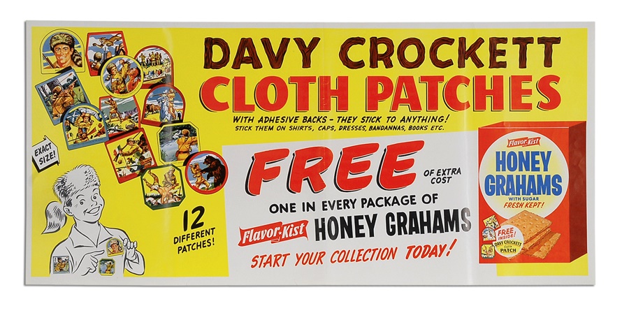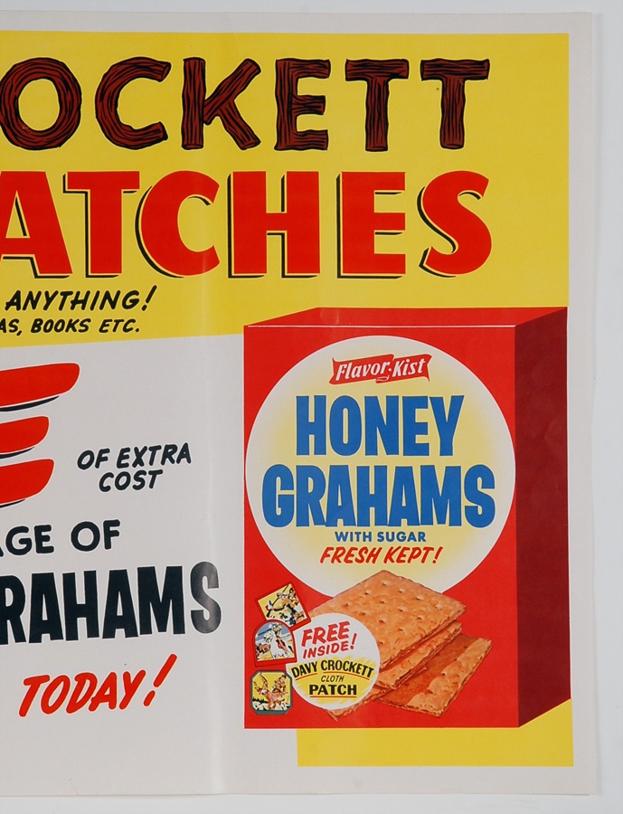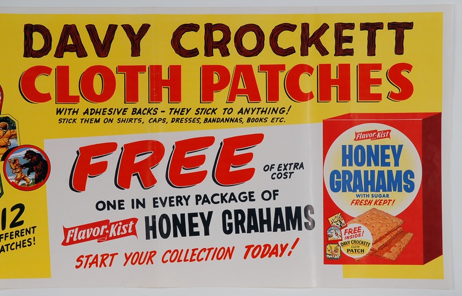 Colorful and evocative of a simpler time, this terrific in-store advertising display from the mid-1950s promotes Davy Crockett premium patches that were enclosed with Flavor-Kist Honey Grahams crackers. Technically, the poster is in VG condition with a fold down the center but displays better. The display measures 39.5x18" and showcases 12 "exact size" patches that are described as having adhesive backs. A wonderful piece of pop culture nostalgia!