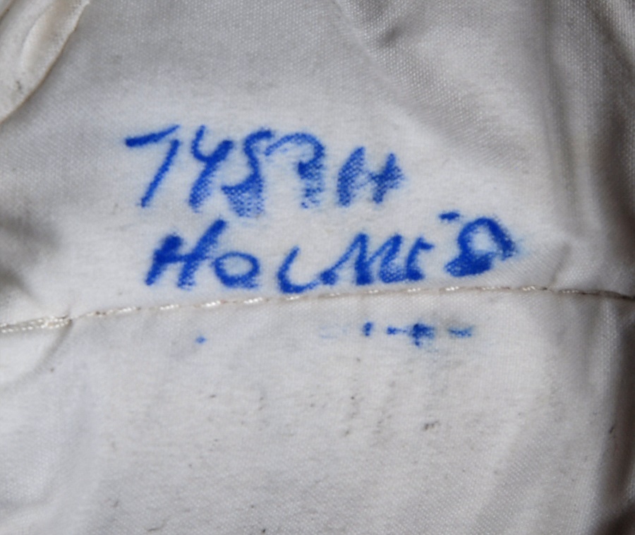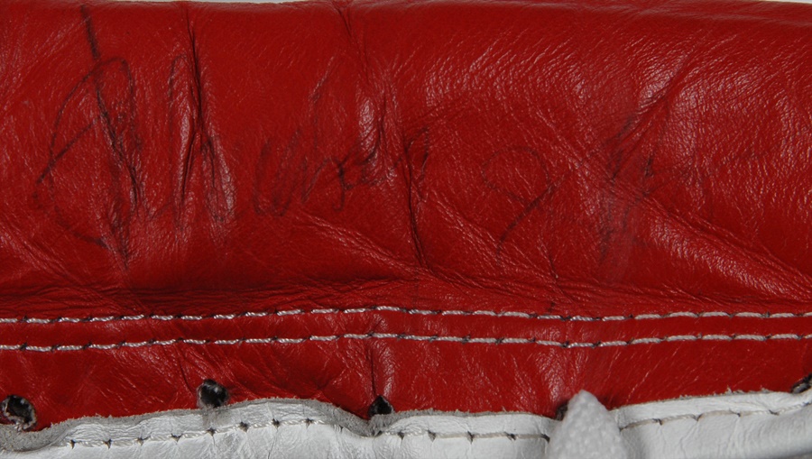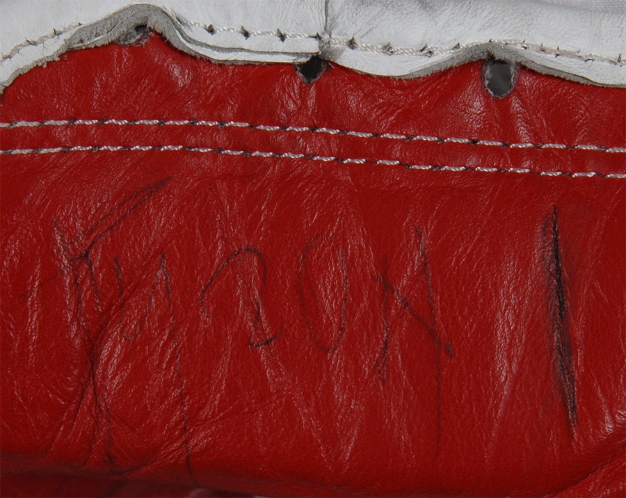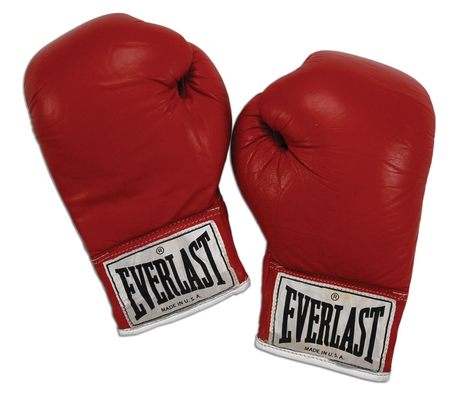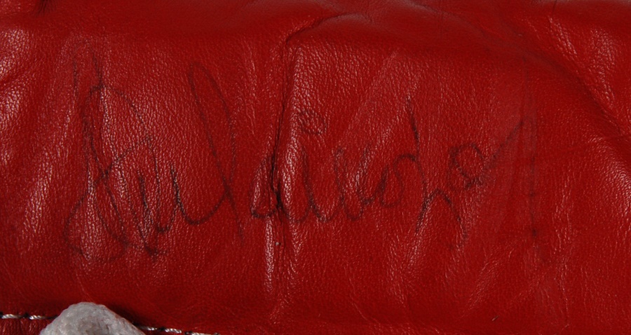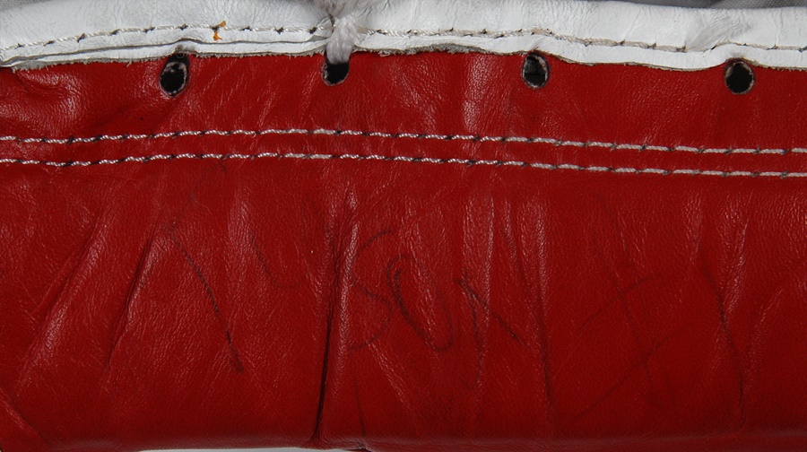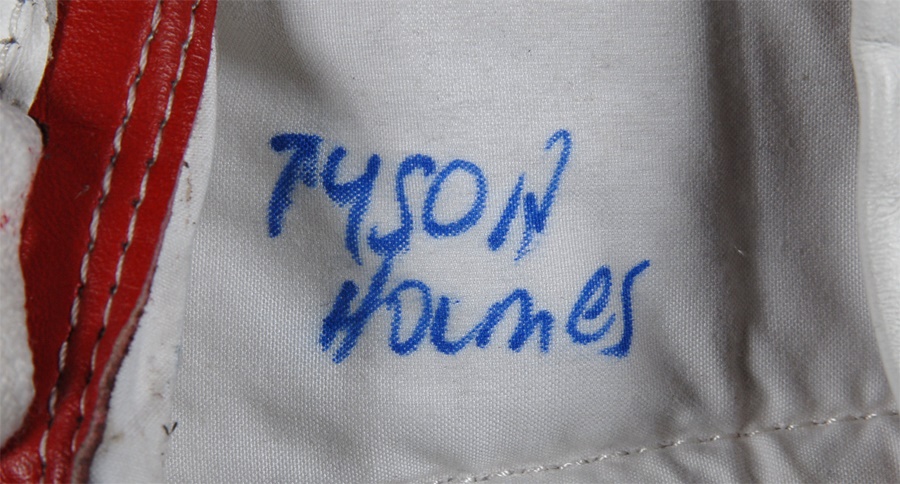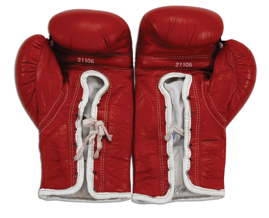 These are the actual fight-worn gloves used by heavyweight champion Mike Tyson to put away former champion Larry Holmes in the 4th round of their January 22, 1988 title fight. These perfectly intact gloves are red leather and have an Everlast label at each wrist, and part of the original laces remain. Stamped 21106 by Everlast on the palm side, labeled inside the gloves "Tyson-Holmes." Letter of authenticity from Tyson's early professional assistant manager Steve Lott and a video of the fight showing Tyson wearing the gloves.