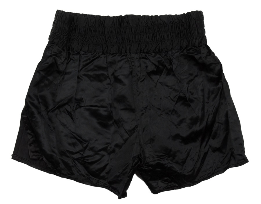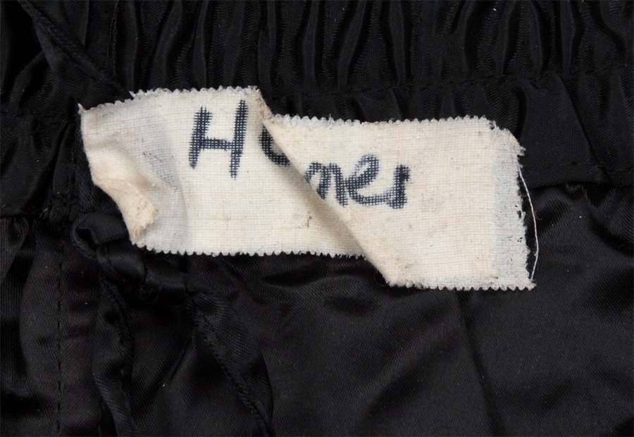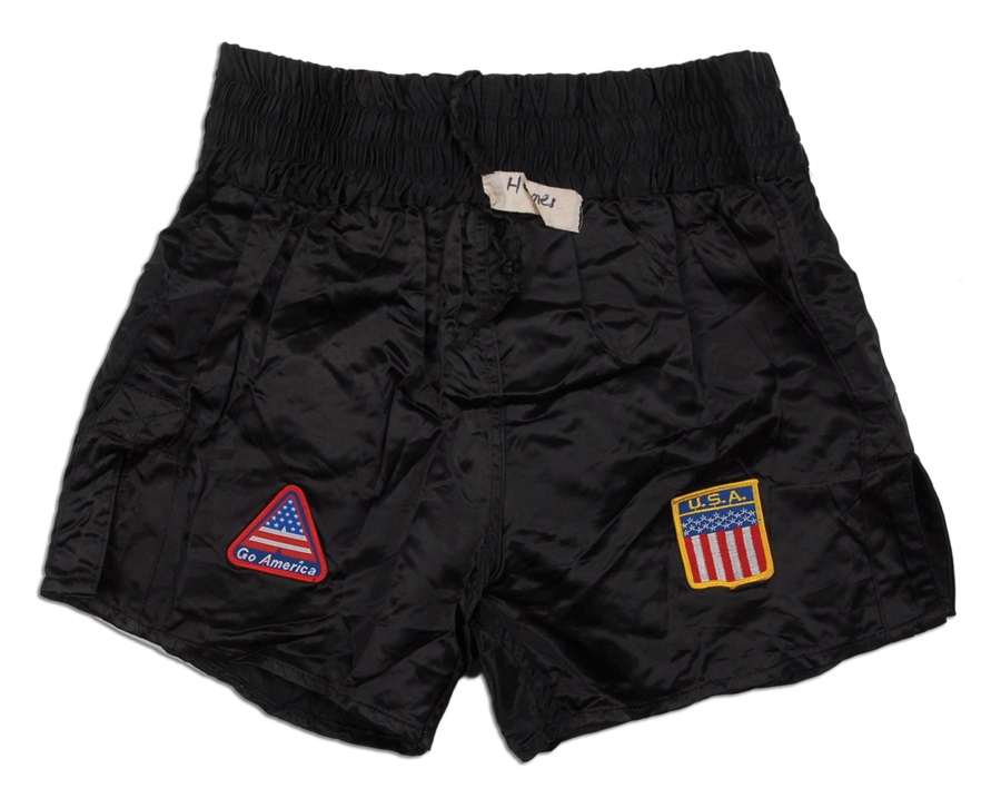 Offered here are the actual fight-worn trunks used by Mike Tyson in his victory over Larry Holmes on January 22, 1988. Classic Tyson trunks which are black satin with black trim. On lower right leg there is a GO AMERICA patch and on the lower left leg a USA patch. The trunks are large in size and have a drawstring at waist with label inside for Tyson-Holmes. Offered with a letter of authenticity from Tyson's early professional assistant manager Steve Lott and a video of the fight showing Tyson wearing the trunks.