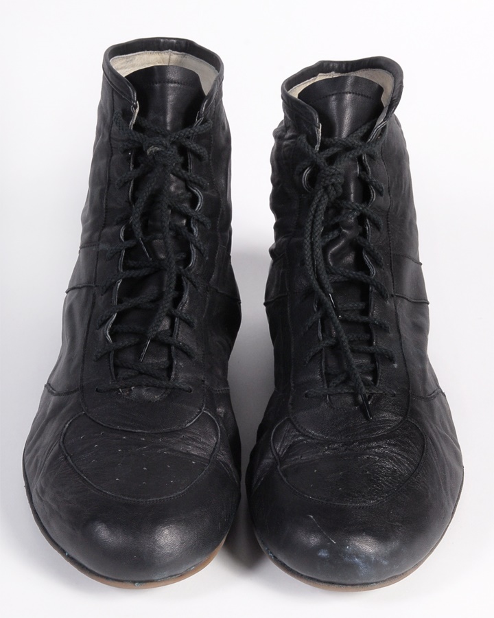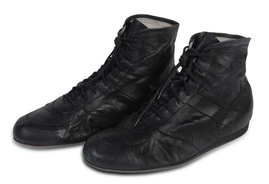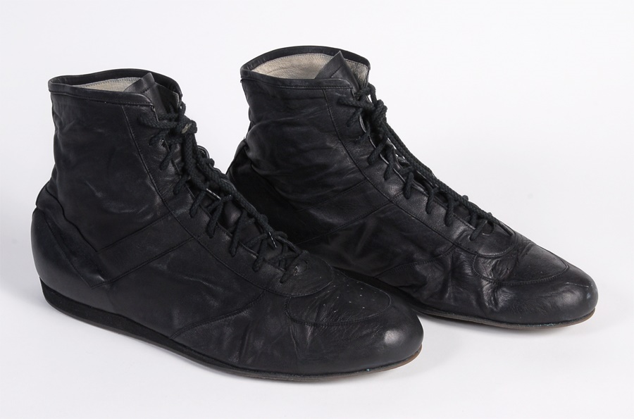 These are the actual fight worn shoes used by Mike Tyson in his heavyweight championship fight with Tony Tucker in Las Vegas on August 1, 1987. Tyson defended his title with a unanimous decision win over 12 rounds. These are the classic Tyson black leather with black laces, size 13 1/2 boxing shoes. The shoes are perfectly intact although well worn and are labeled inside on the gray interior fabric, "Tyson vs. Tucker 8/1/87." Comes with a letter of authenticity from Tyson's early assistant manager Steve Lott and a video of the fight showing Tyson wearing the shoes.