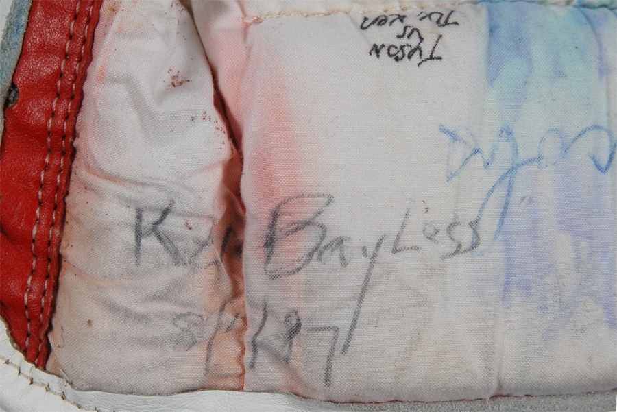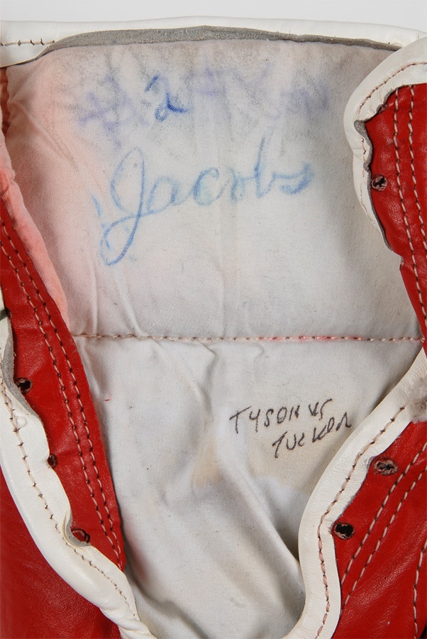 These are the championship fight worn gloves used by "Iron" Mike Tyson in his title defense against Tony Tucker on August 1, 1987. The gloves are red leather with an Everlast manufacturer's label at each wrist and they are marked, "Tyson-Tucker." Inside the right glove are the names of Tyson's manager Jimmy Jacobs and also Ken Bayliss. The left glove has Jacobs' name only. The gloves are well worn, but perfectly intact. Comes with a letter of authenticity from Tyson's early assistant manager Steve Lott and a video of the fight showing Tyson wearing the gloves.