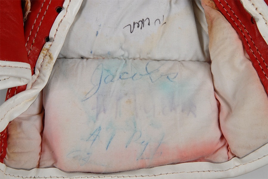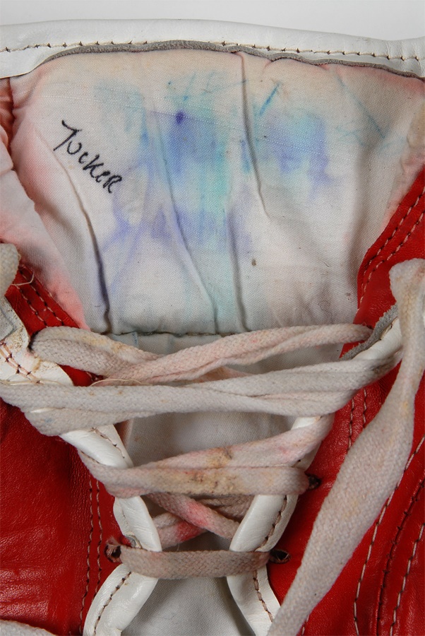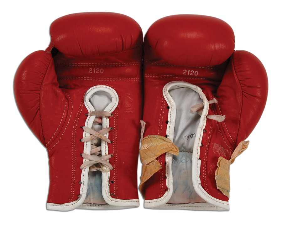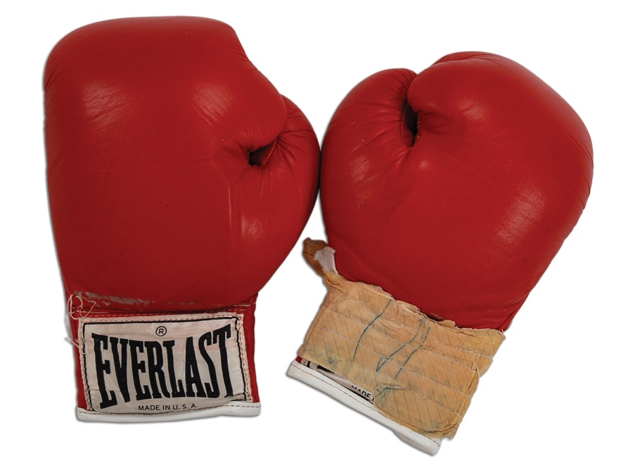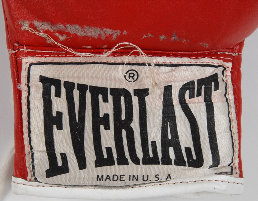 Offered here are the fight worn gloves used by Tony Tucker in his title unification bout with Mike Tyson on August 1, 1987. Tucker held the IBF World Title going into the fight. Tyson won a 12-round decision to lay claim to all three world titles. Tucker's gloves are red leather with a manufacturer's label for Everlast at each wrist. They have partial white laces. Gloves are marked inside, "Tucker." Well worn, but perfectly intact. Letter of authenticity from Tyson's assistant manager Steve Lott who took possession immediately after the fight. A rare offering from another world heavyweight champion which comes with a video of the fight showing Tucker wearing the gloves.