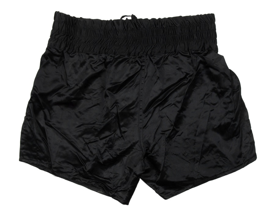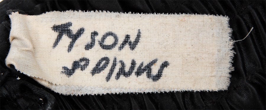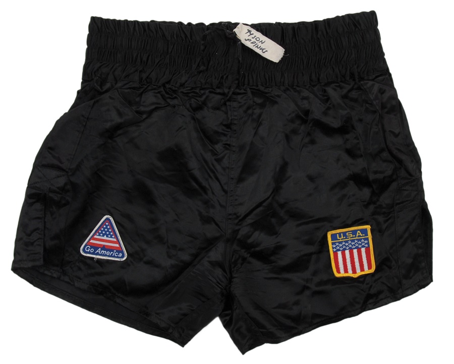 On June 27, 1988 at the Convention Center in Atlantic City, heavyweight champions Michael Spinks and Mike Tyson squared off in a title unification fight. Many sportswriters had actually given Spinks a chance in this fight, but Tyson disproved them all, taking the frightened Spinks out in the very first round. Offered here are the actual fight trunks worn by Tyson in the fight. Tyson's classic black satin with black trim and USA and GO AMERICA patches on each leg. There is a label, "Tyson-Spinks" inside the front waist at the drawstring. Used, but perfectly intact. The trunks from arguably one of the biggest fights in the career of "Iron" Mike Tyson. Letter of authenticity from Tyson's early assistant manager Steve Lott and a video of the fight showing Tyson wearing the trunks.