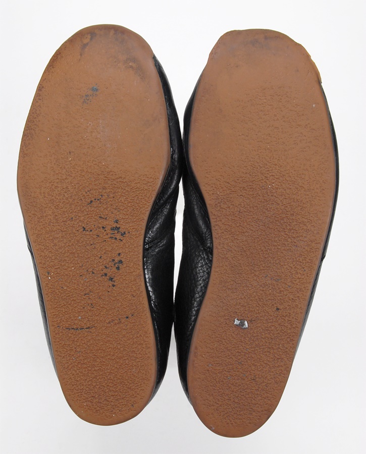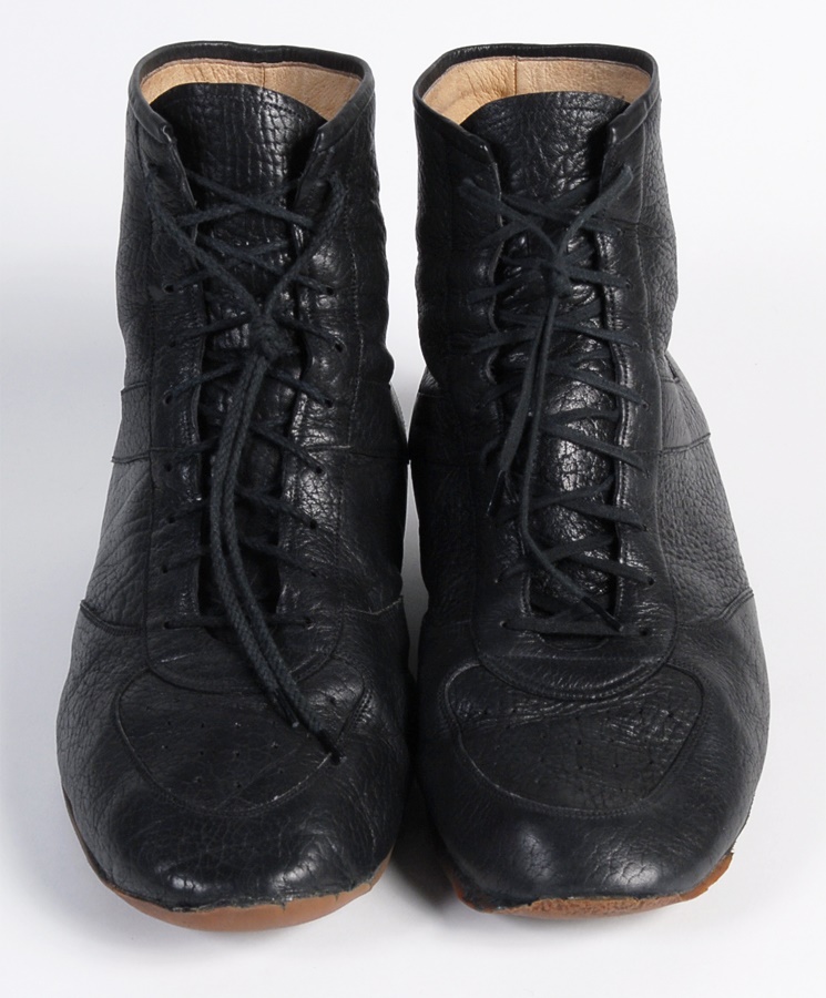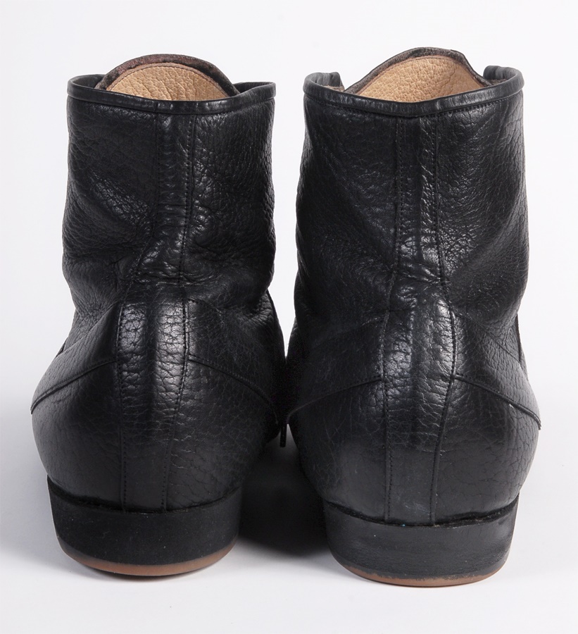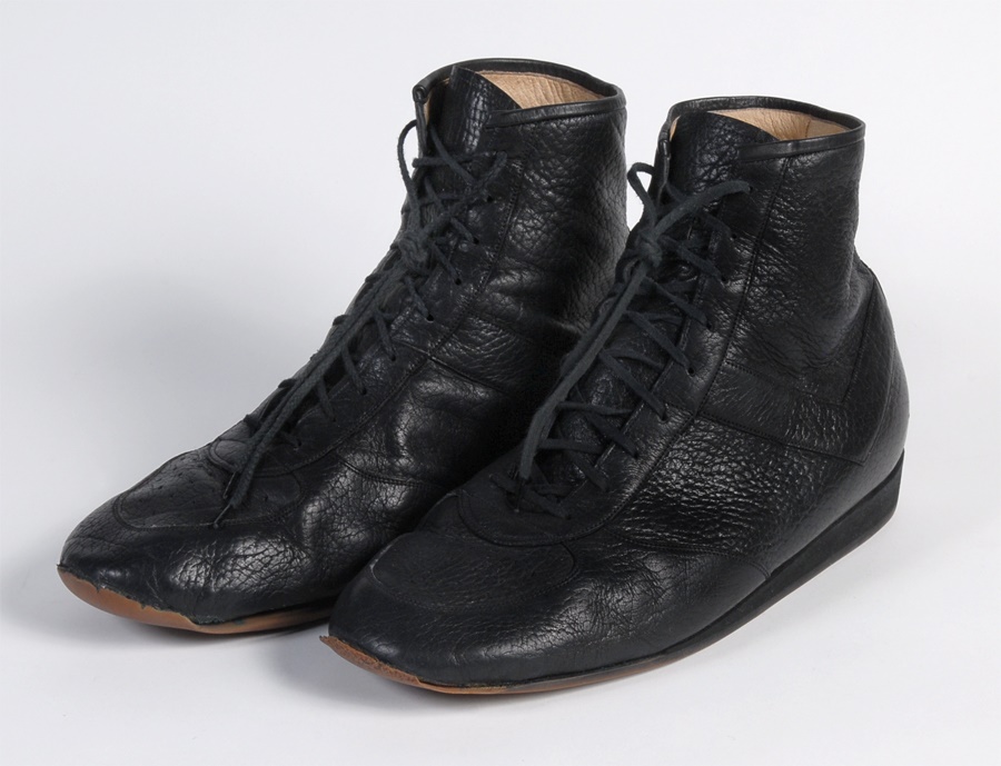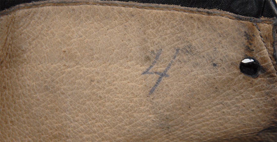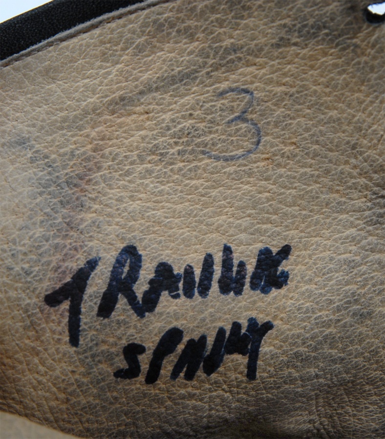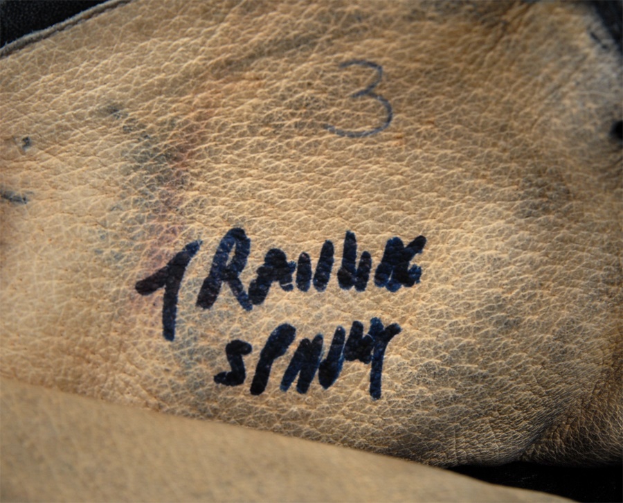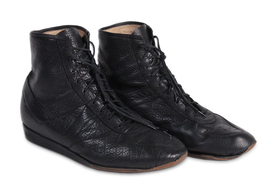 These are shoes "Iron" Mike Tyson used in training for his June 27, 1988 fight with Michael Spinks which ended with Tyson destroying Spinks in one round. The shoes are classic Tyson, black leather with black laces showing heavy wear. No manufacturer's label. Inside the left shoe they are marked, "Training Spinks." Come with a letter of authenticity from Tyson's early assistant manager Steve Lott.