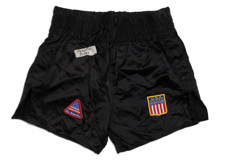 These are the actual fight trunks worn by "Iron" Mike Tyson in his championship fight with Tony Tubbs in Tokyo, Japan, on March 21, 1988. Tyson made short work of Tubbs, stopping him in the 2nd round. These trunks are the classic Tyson black satin with black trim including USA and GO AMERICA patches on the lower front legs. Labeled inside the waist drawstring, Tyson-Tubbs. Show wear, but perfectly intact. Comes with a letter of authenticity from Tyson's early assistant manager Steve Lott and a video of the fight showing Tyson wearing the trunks.