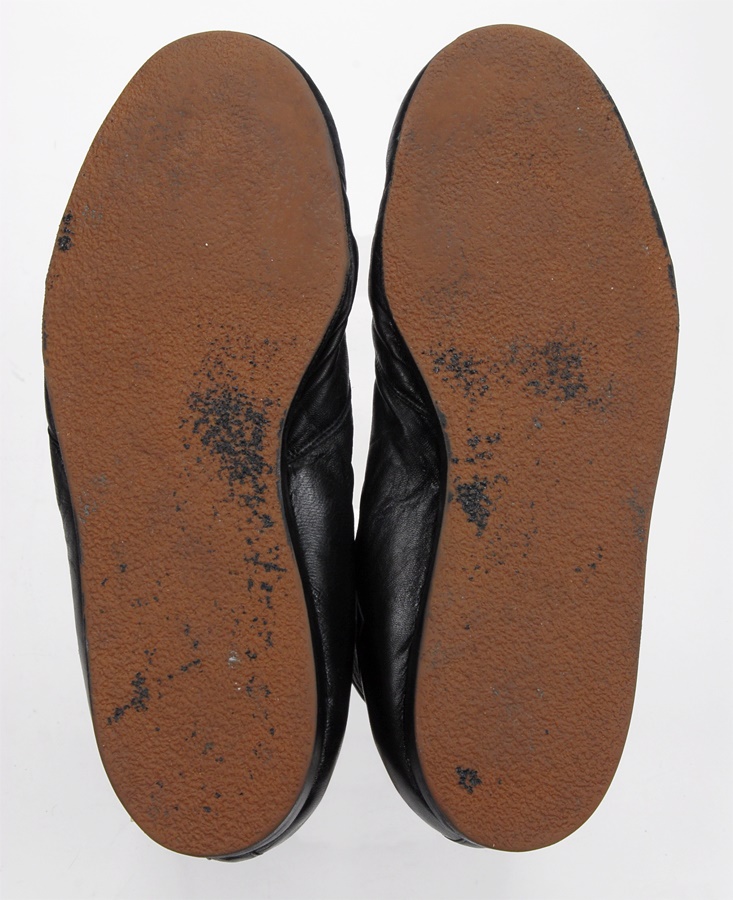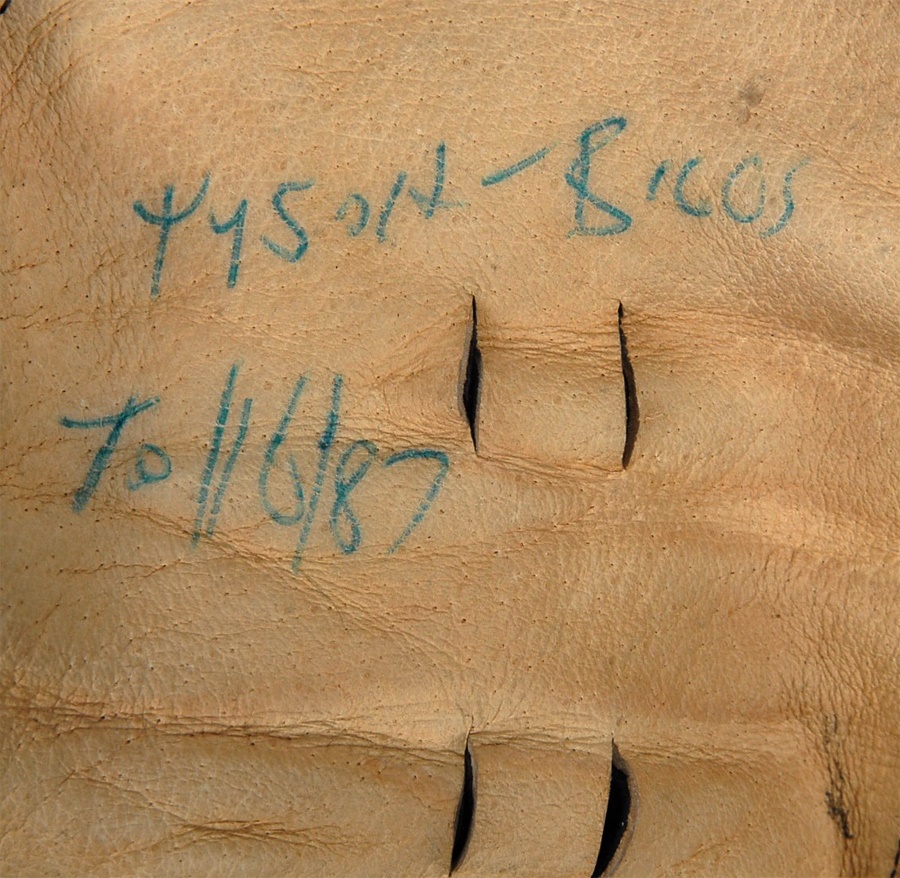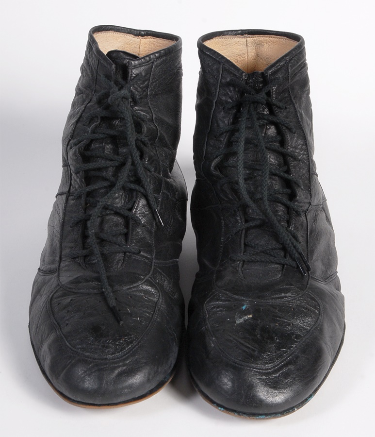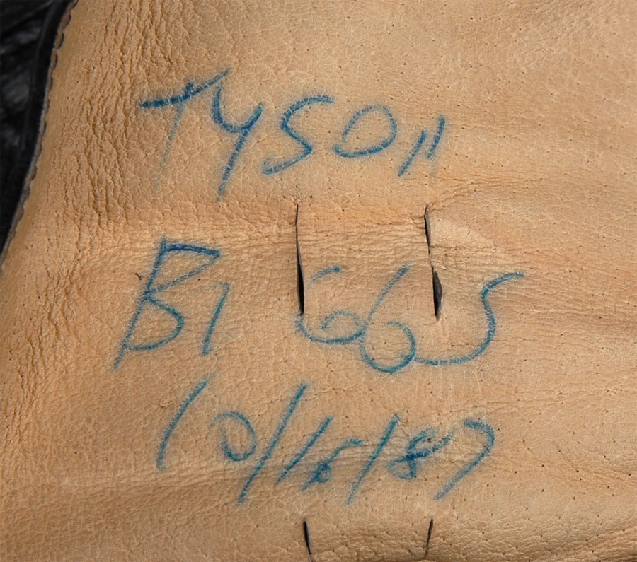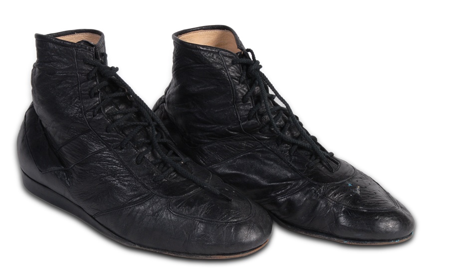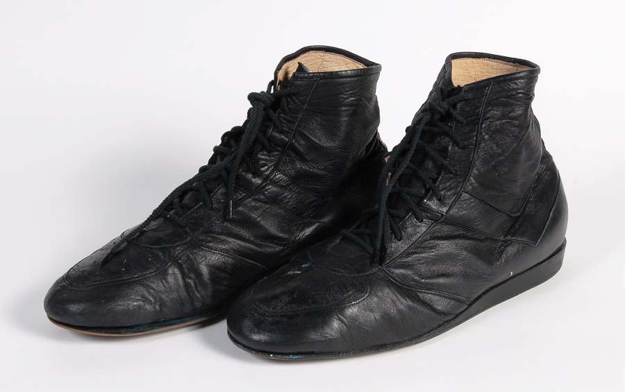 These are the actual fight worn shoes used by "Iron" Mike Tyson in his fight with Tyrell Biggs in Atlantic City on October 16, 1987. Tyson successfully defended his title, stopping Biggs in the 7th round. The shoes are classic Tyson black leather with black laces, size 13 1/2. Each shoe is marked inside the tongue, "Tyson-Biggs 10/16/87." Shoes show wear, but are still perfectly intact. Comes with a letter of authenticity from Tyson's early assistant manager Steve Lott and a video of the fight showing Tyson wearing the shoes.