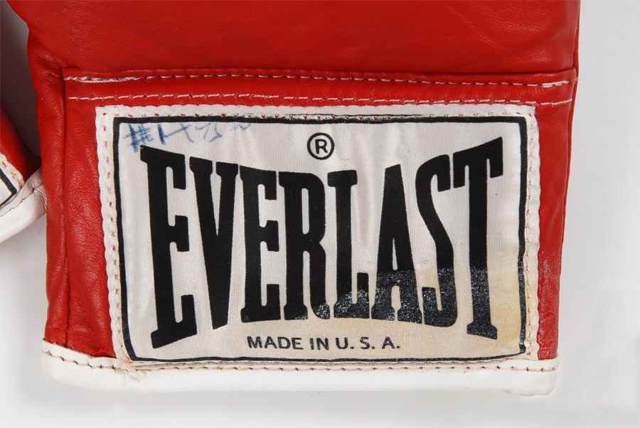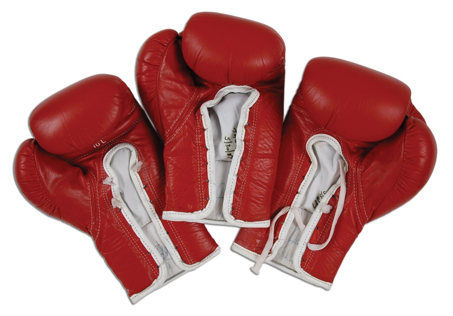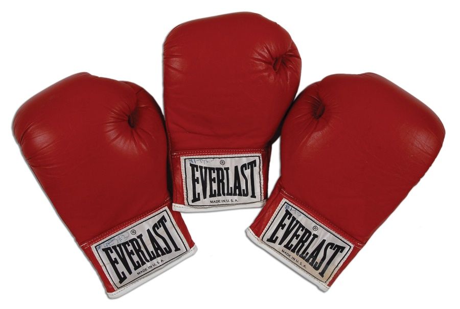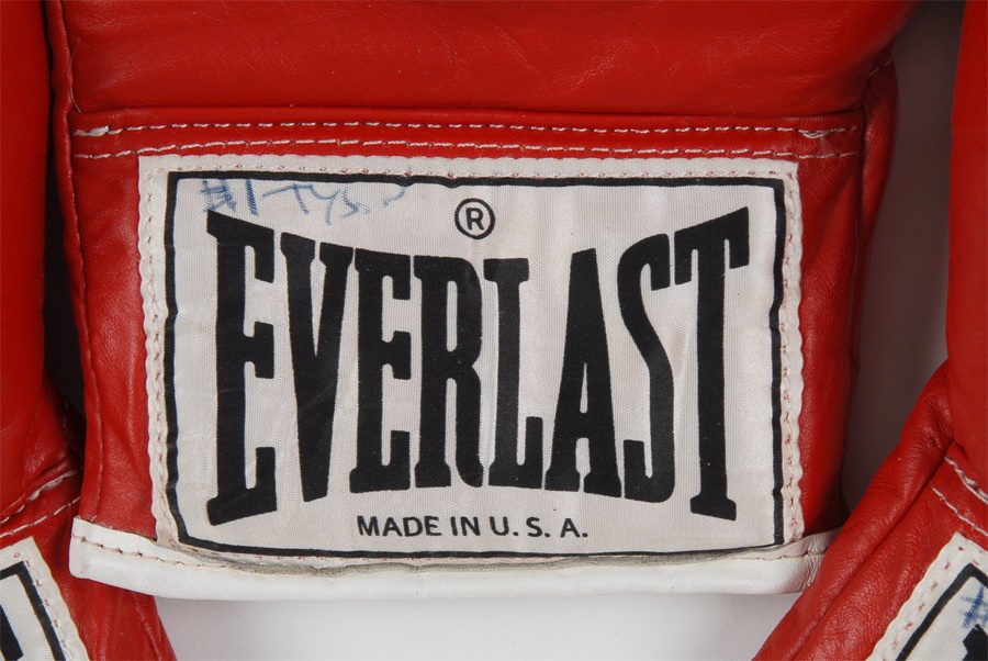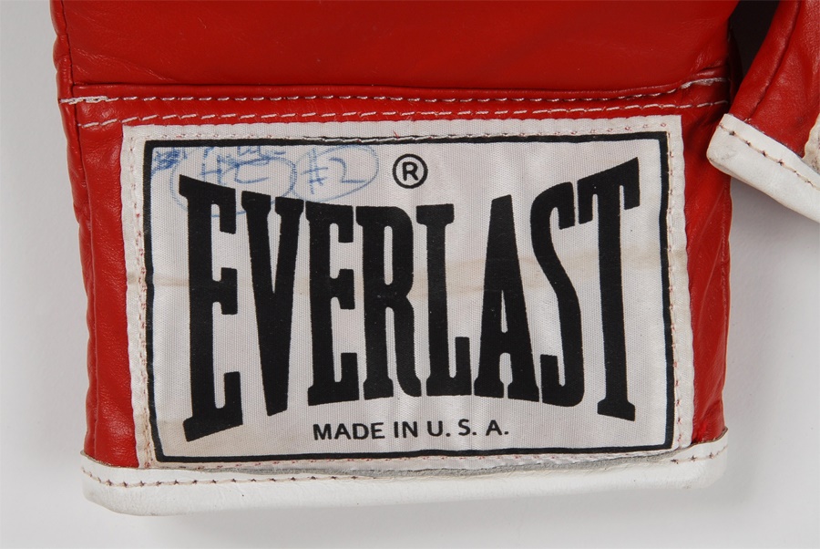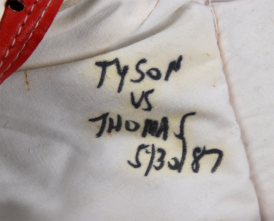 These are the actual fight-worn gloves used by former heavyweight champion Pinklon Thomas in his title match with heavyweight champion Mike Tyson on May 30, 1987. There are actually three gloves offered as one of Thomas' gloves had to be replaced during the fight. The gloves are red leather, 10 ounce gloves with an Everlast label at the wrists. Each glove is labeled inside, "Pinklon Thomas." Gloves have partial laces. Comes with a letter of authenticity from Tyson's early assistant manager Steve Lott who took possession of the gloves after the fight and also with a video of the fight showing Thomas using the gloves.
