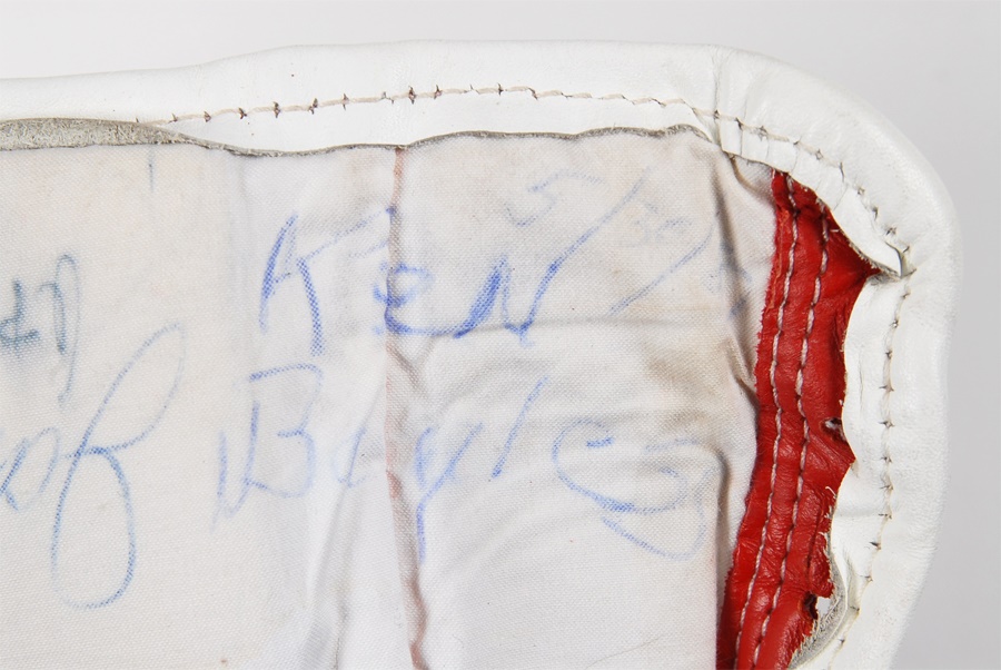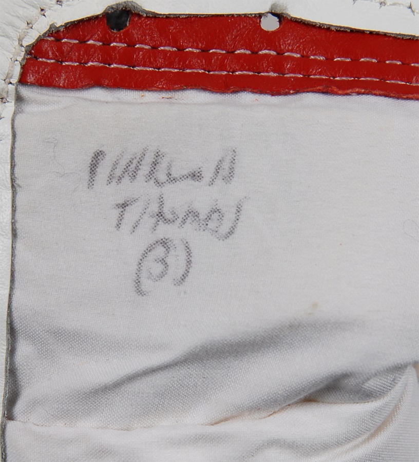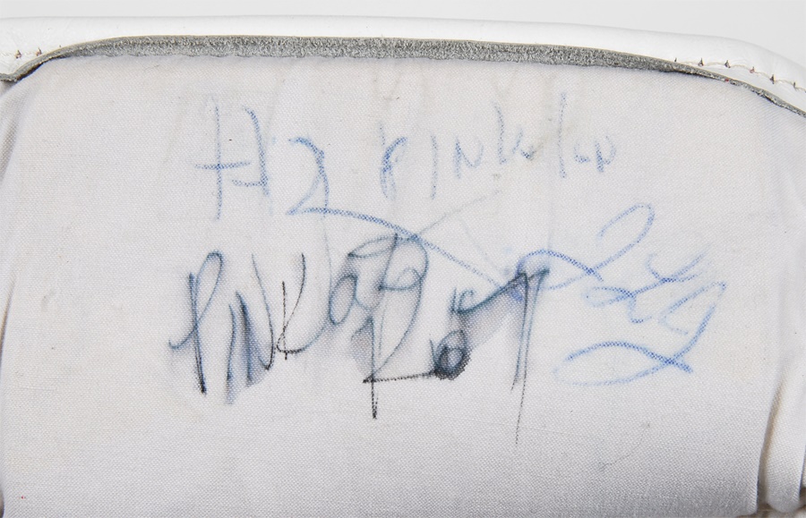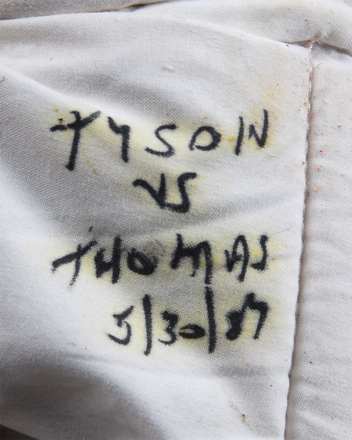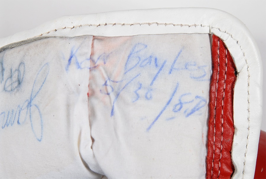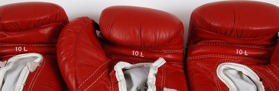 These are the actual fight-worn gloves used by former heavyweight champion Pinklon Thomas in his title match with heavyweight champion Mike Tyson on May 30, 1987. There are actually three gloves offered as one of Thomas' gloves had to be replaced during the fight. The gloves are red leather, 10 ounce gloves with an Everlast label at the wrists. Each glove is labeled inside, "Pinklon Thomas." Gloves have partial laces. Comes with a letter of authenticity from Tyson's early assistant manager Steve Lott who took possession of the gloves after the fight and also with a video of the fight showing Thomas using the gloves.