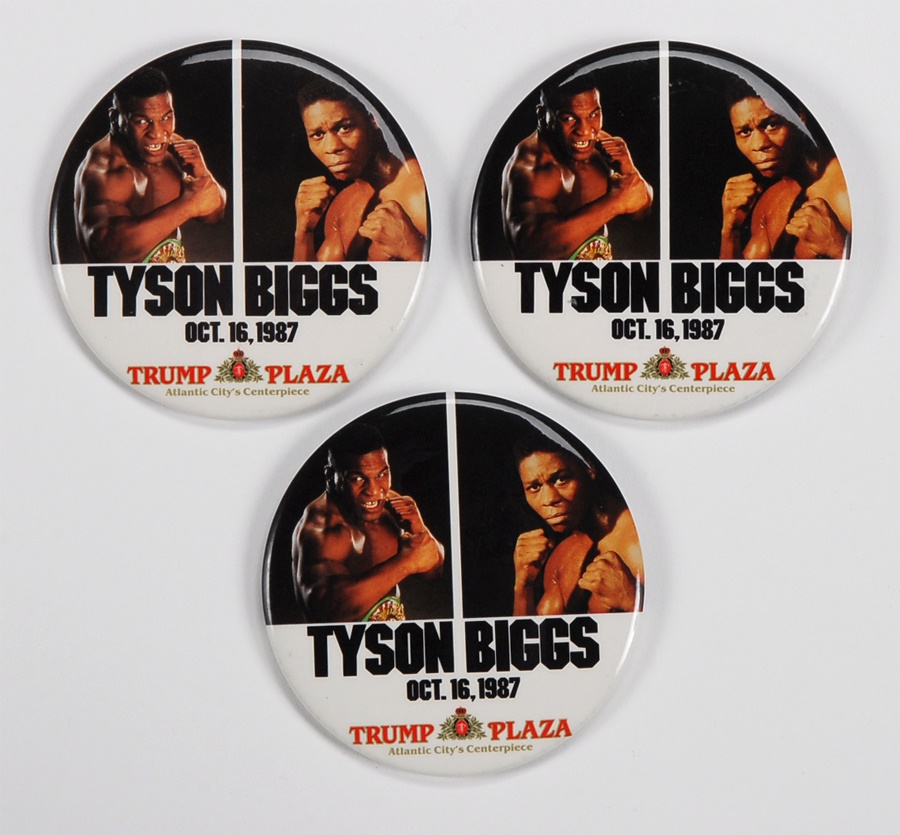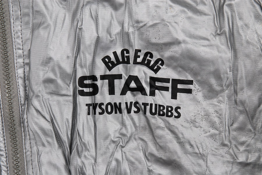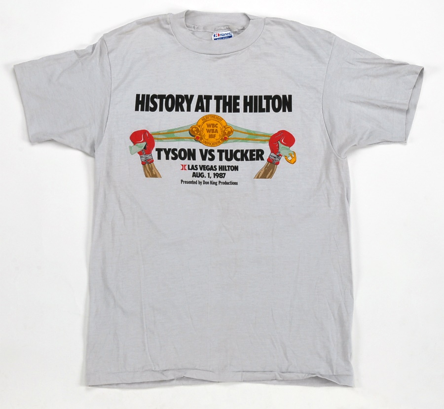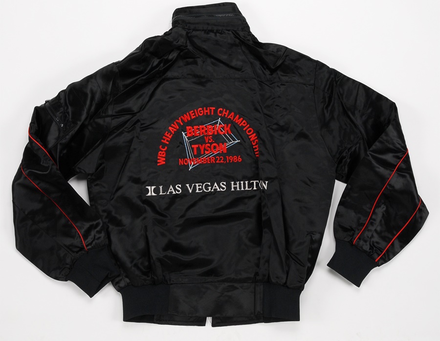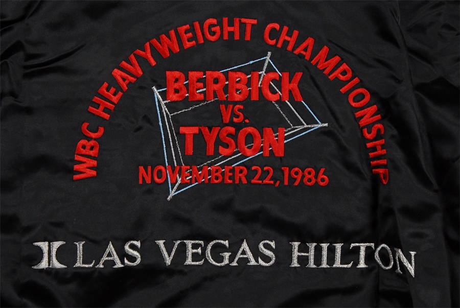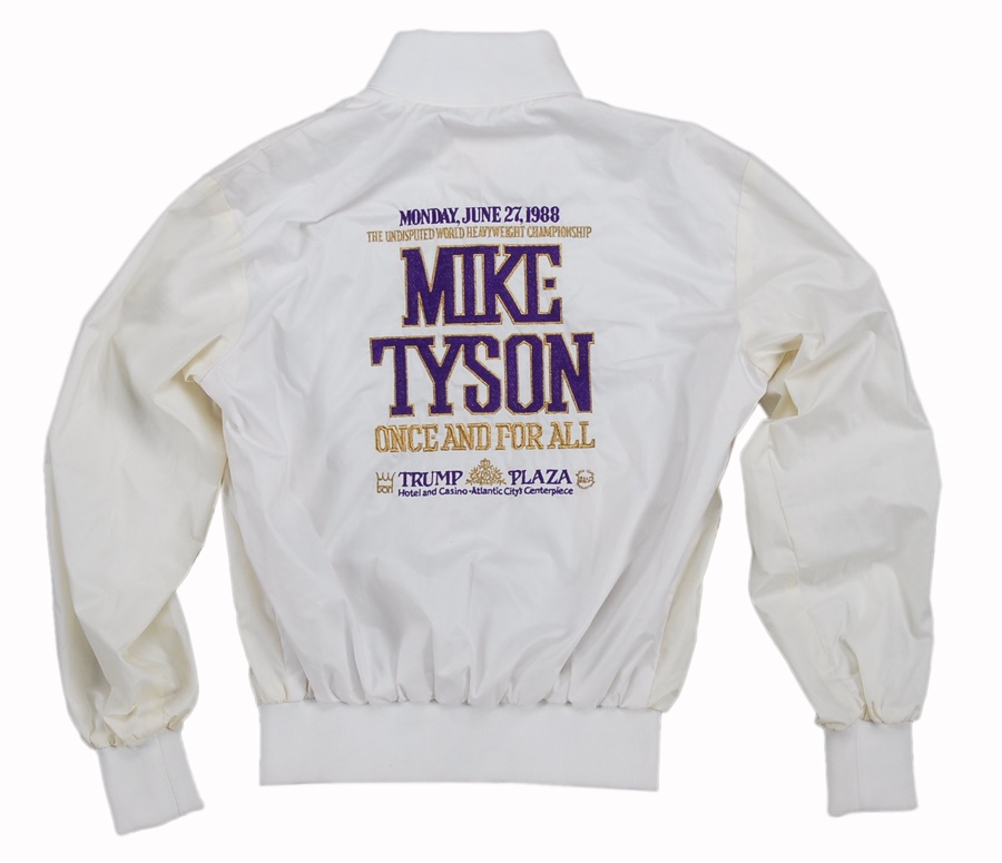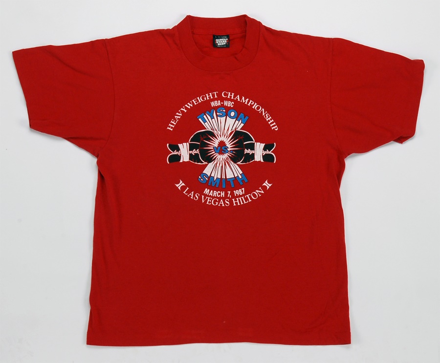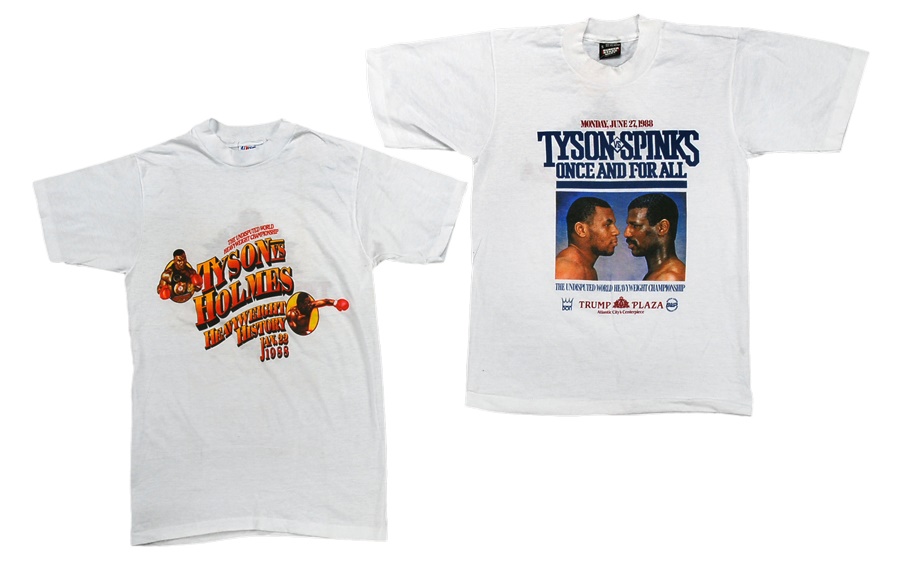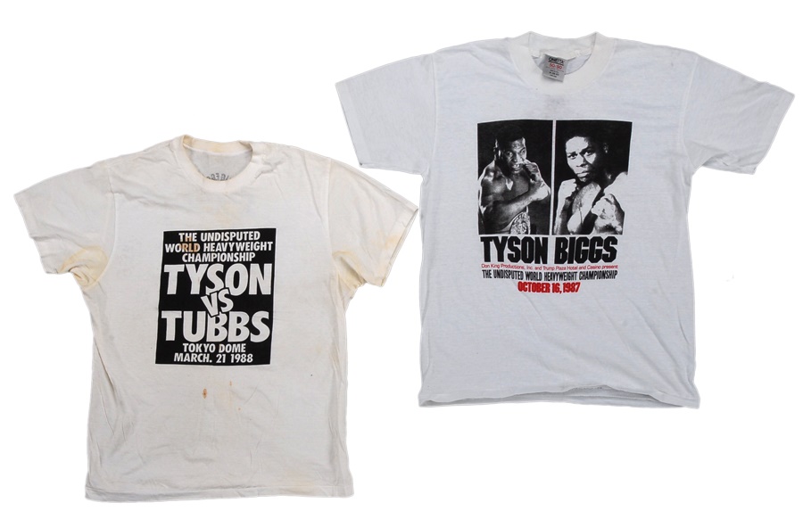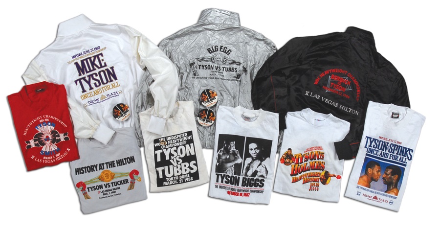 This is a fabulous lot of 12 souvenir items collected by Tyson's early assistant manager Steve Lott during his time with "Iron Mike." Includes: Tyson-Spinks Jacket (L), Tyson-Spinks T-shirt (S-still tagged), Tyson-Tubbs silver jacket (clean), Tyson-Tubbs T-shirt (worn), Tyson-Tucker T-shirt (L), Tyson-Holmes T-shirt (S-clean), Tyson-Biggs T-Shirt (M-clean), three Tyson-Biggs Pins (Mint), Tyson-Berbick jacket (M-not worn) and Tyson-Smith T-shirt (L-light wear). A very seldom seen group from many of Tyson's championship fights.