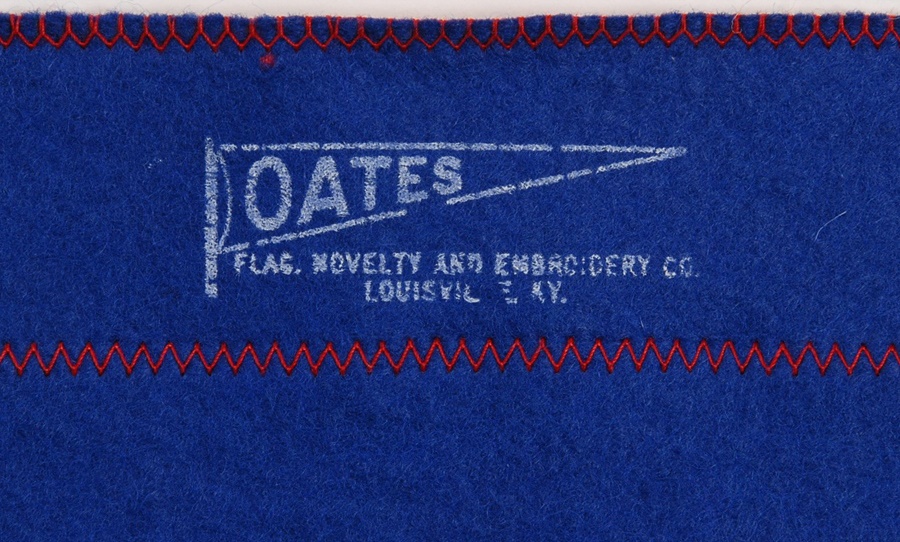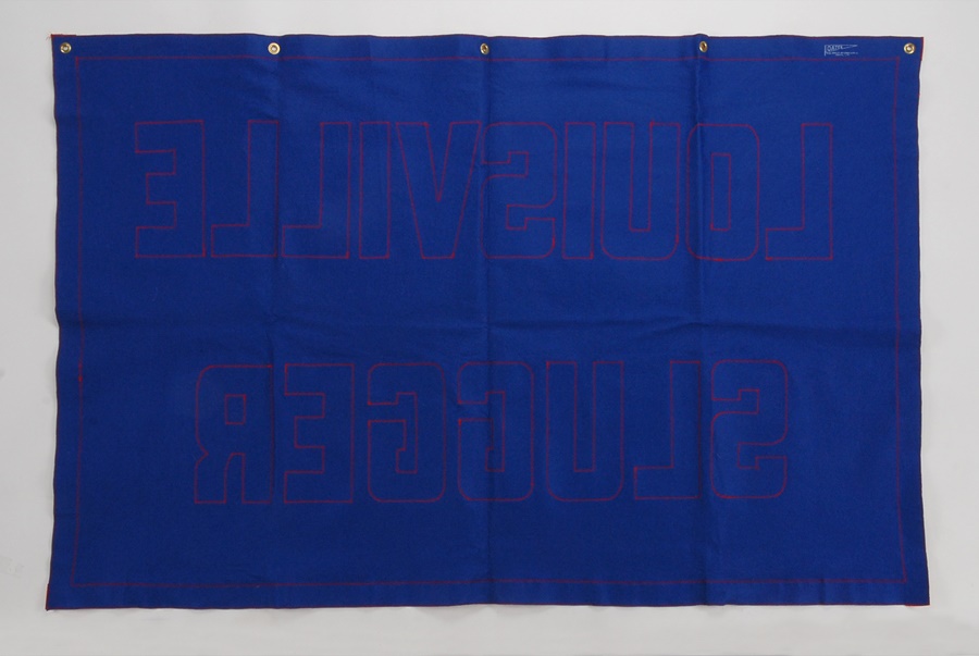 Here's a vintage blue felt banner with red satin lettering sewn on. It appears to date from the 1960s and is in NRMT condition. There are grommets at the top used for hanging the banner, which measures roughly 58" x 37.5." It was obtained from the Hillerich and Bradsby archives auction in Kentucky.