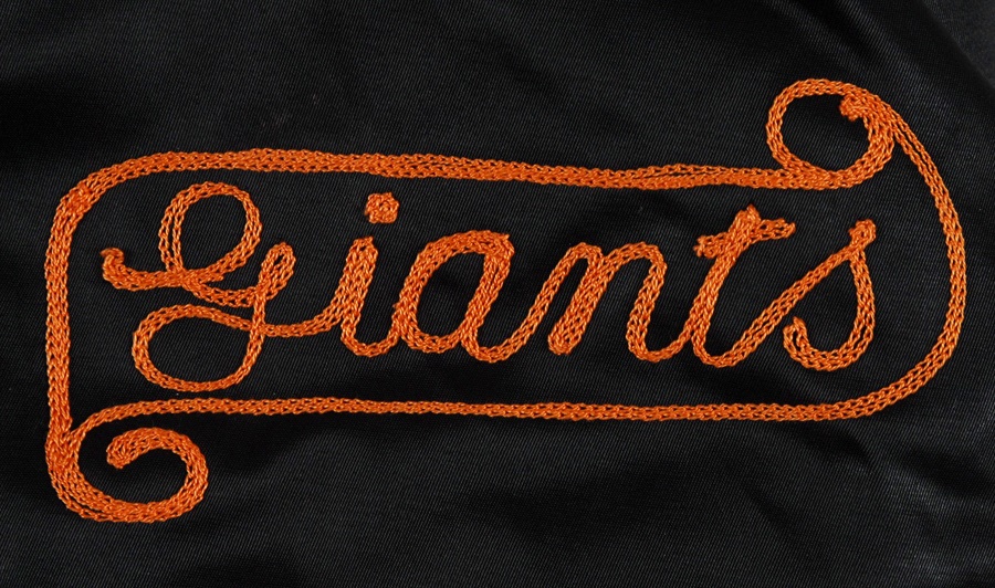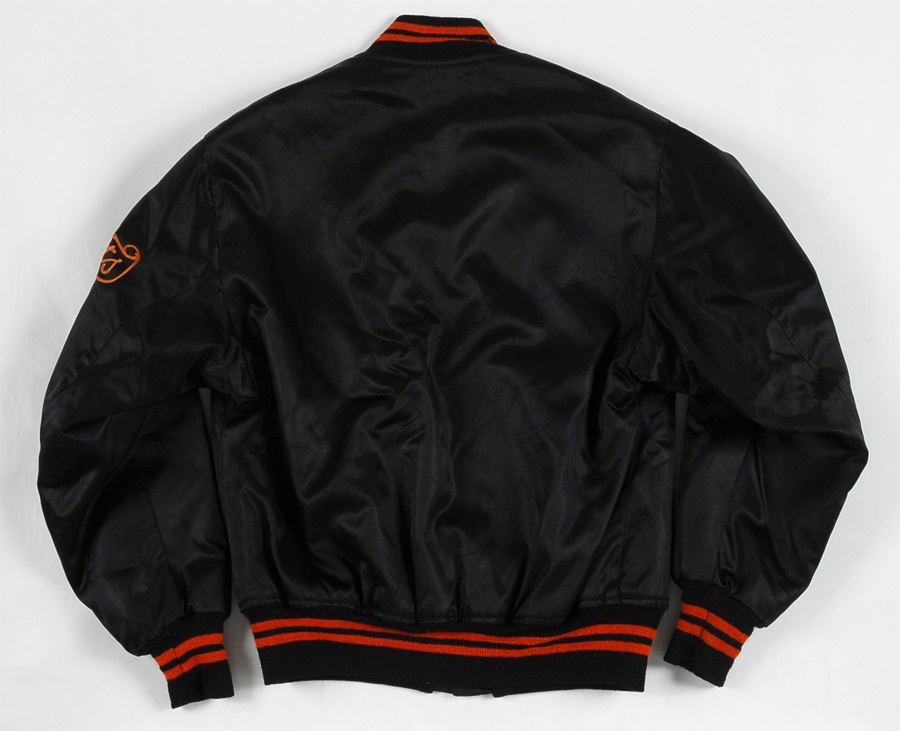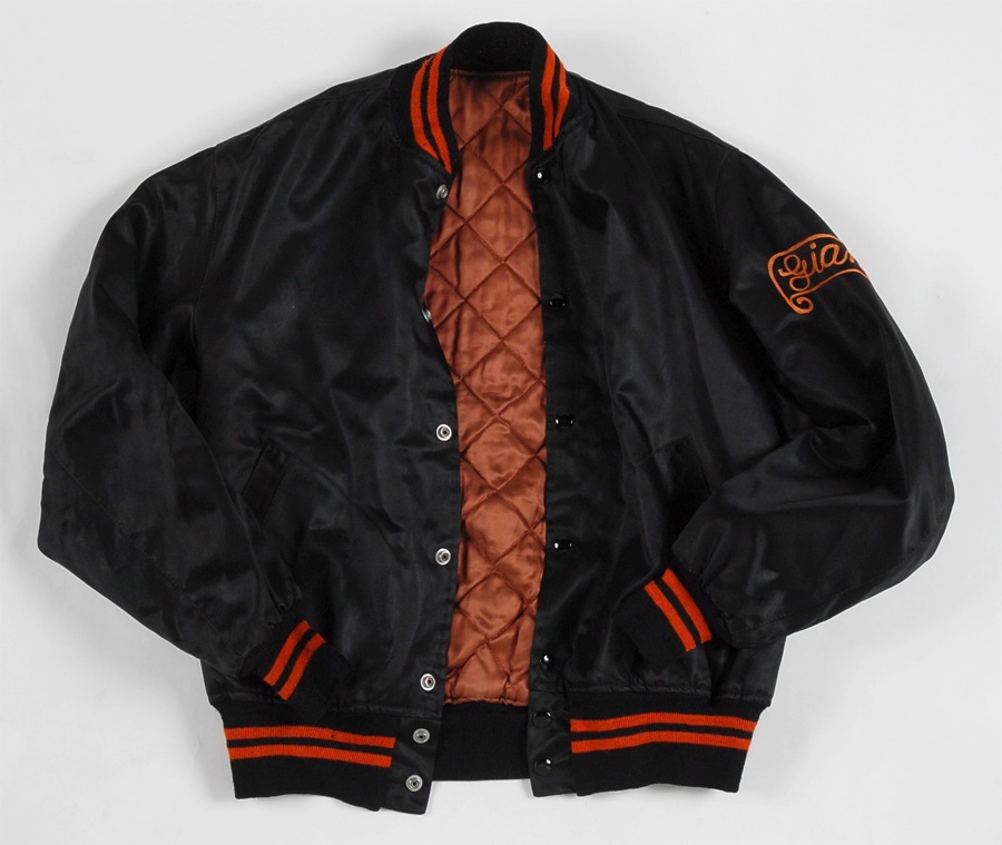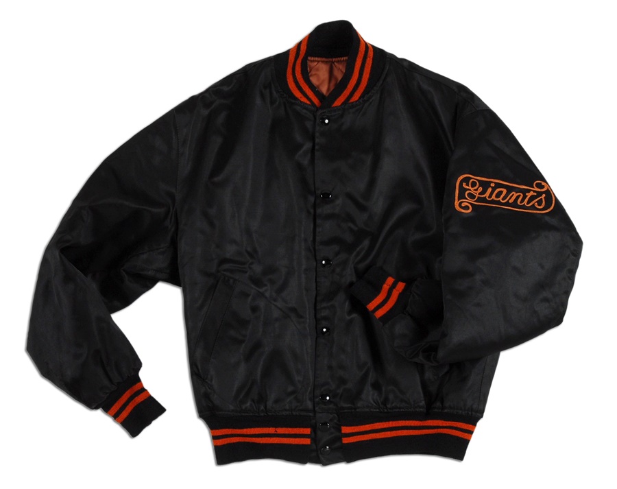 This black satin jacket is the type that was worn by the players and coaches on those cool New York nights. It is also satin lined with cloth collar and cuffs. "Giants" is embroidered on the left sleeve in orange script. The right pocket contains a tag from Tim McAuliffe Athletic Equipment in Boston, Mass, while the other has a tag identifying it as a size 42. This item is in great condition. There is no player identification on the jacket but it comes with a letter from the family of Don Muller stating that family history has it that this jacket once belonged to Leo Durocher, who managed the Giants from 1948 thru 1955.