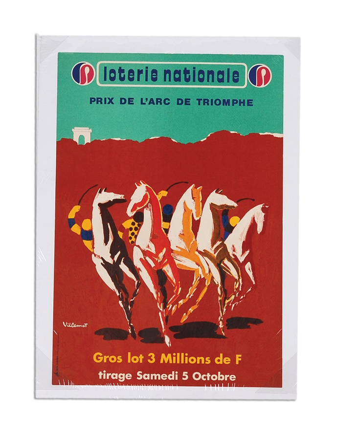 This work was created by the famed poster artist Bernard Villemot, promoting the Prix de L'Arc de Triomphe thoroughbred horse race in Longchamp, France. While there is no year listed, the race that year was sponsored by Loterie Nationale, which sponsored the event between 1949 and 1982. Since his passing in1989, Villemot's works have become more highly sought-after, and he has been referred to as the "painter-laureate of modern commercial art." The work measures 24x18", is mounted on linen, and is in NRMT condition.