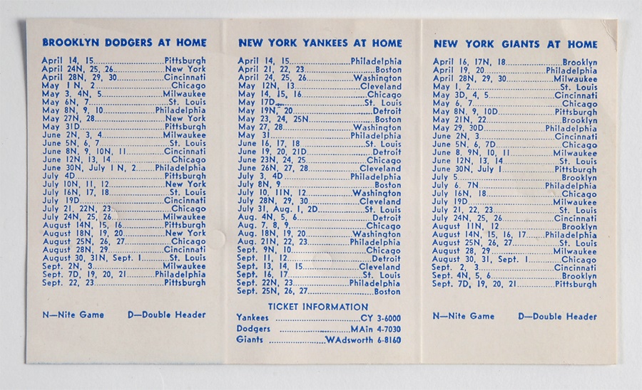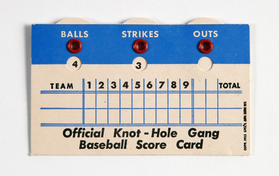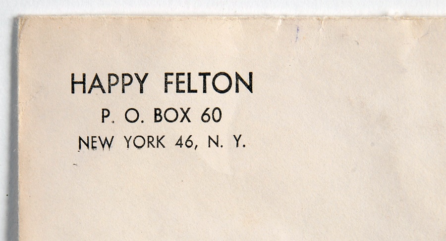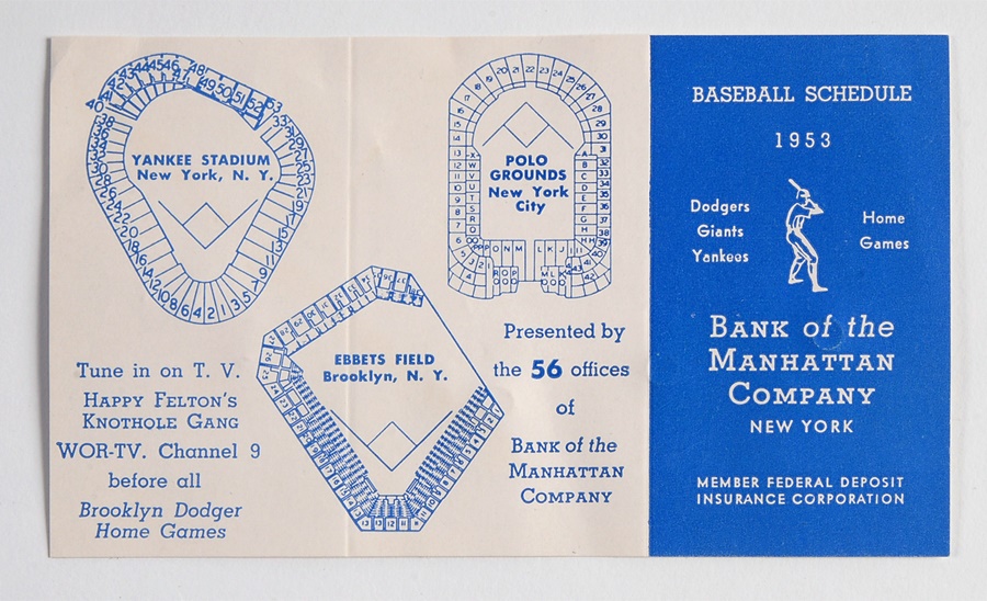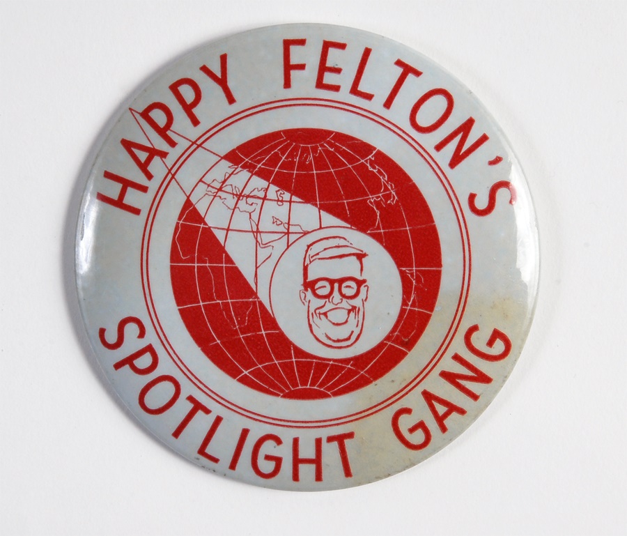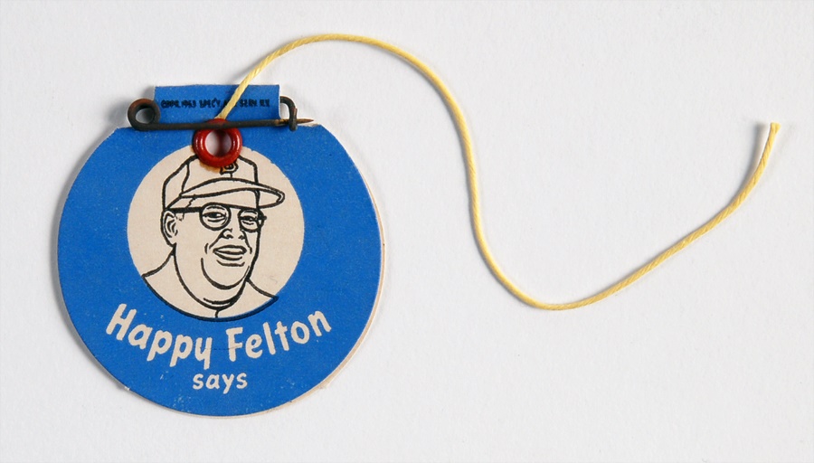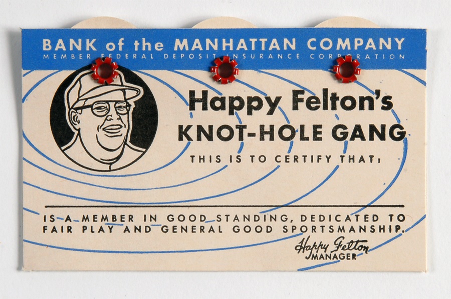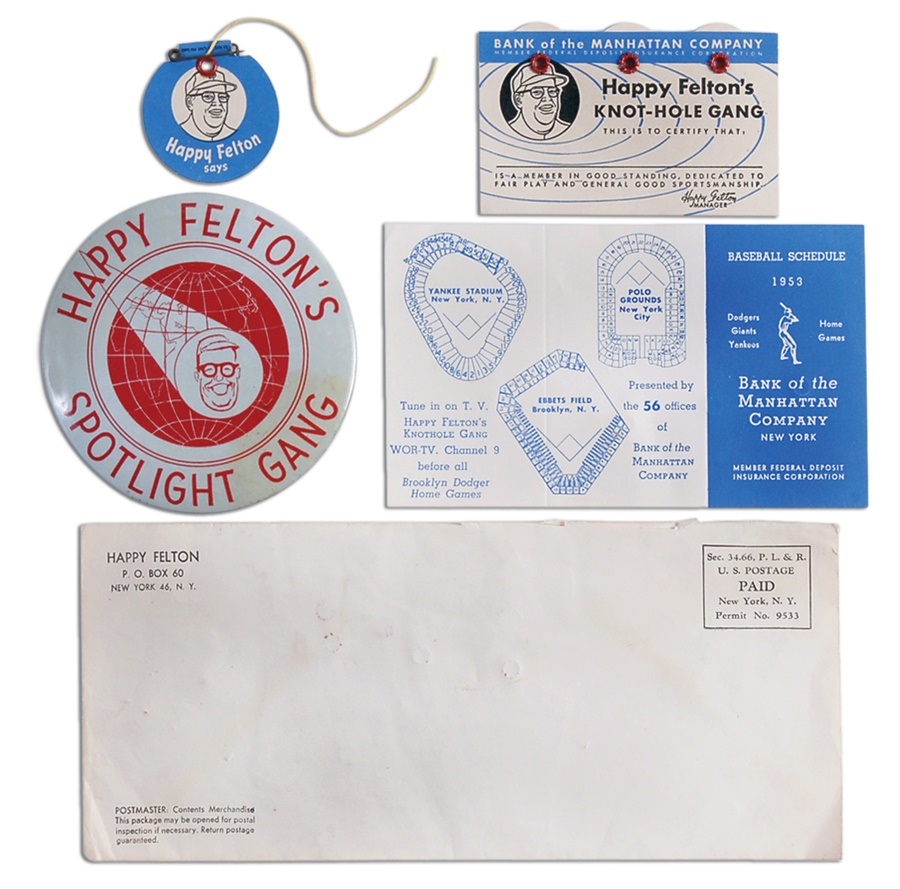 Vaudeville stage and radio actor Happy Felton hosted a local New York City show called "The Knothole Gang," during which he taught kids the finer tips of playing the game of baseball. This collection features a Knot Hole Gang membership card, good sport pin and 1953 schedule card for all three New York City baseball teams (all of which were sponsored by Bank of Manhattan). There is also a large Happy Felton Spotlight Gang button and envelope with Felton's post office box address in the upper-left corner. All but the button appear to be unused, while the button has some staining on the bottom. A cool lot for Big Apple sports historians!