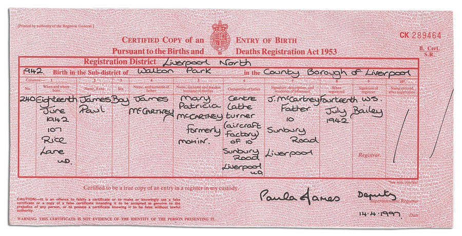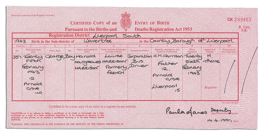 The Fab Four remain the gold standard of rock and roll bands, and these beautifully hand-printed birth notices were the first "publicity" John, Paul, George and Ringo ever received, proclaiming their arrivals on Earth. Straight from the Registry in 1997, these 11x5.5" certified copies are a sight to behold, and a must-have for the most die-hard Beatles fanatic.