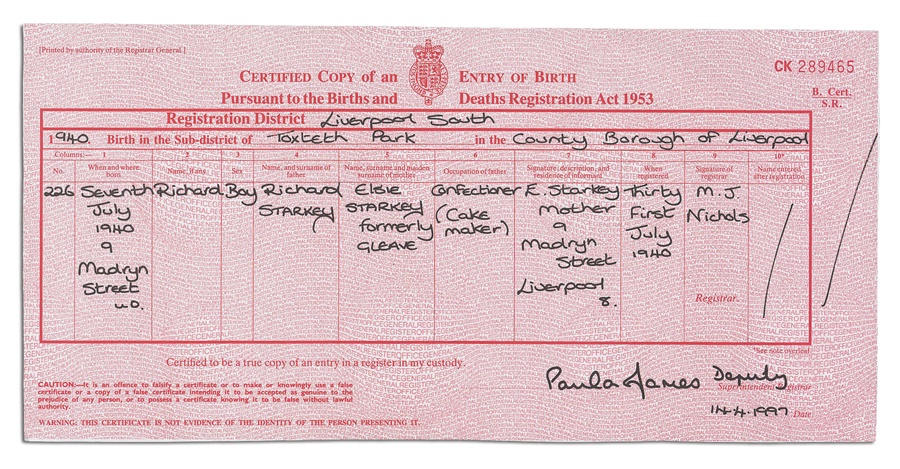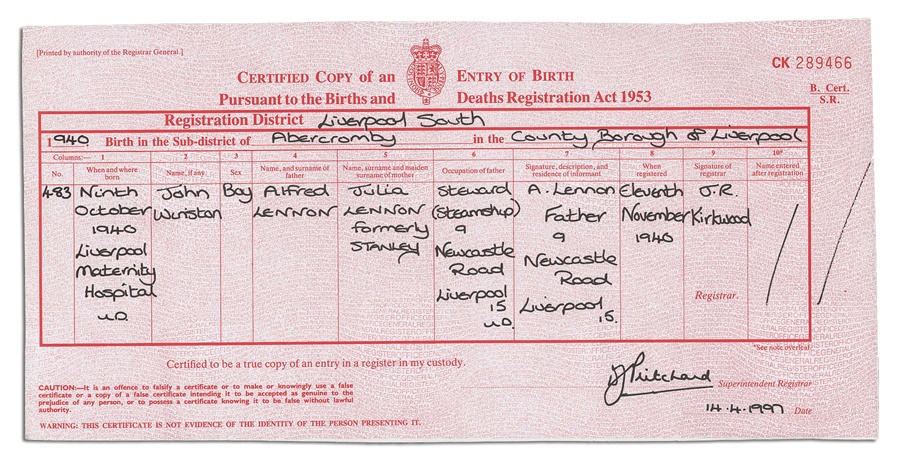 Lot # 776: Beatles Authentic Birth Certificates (4)