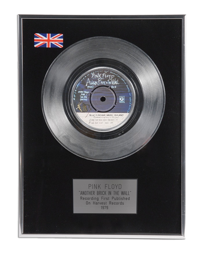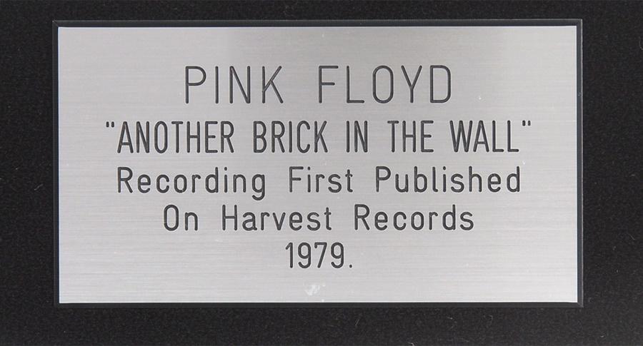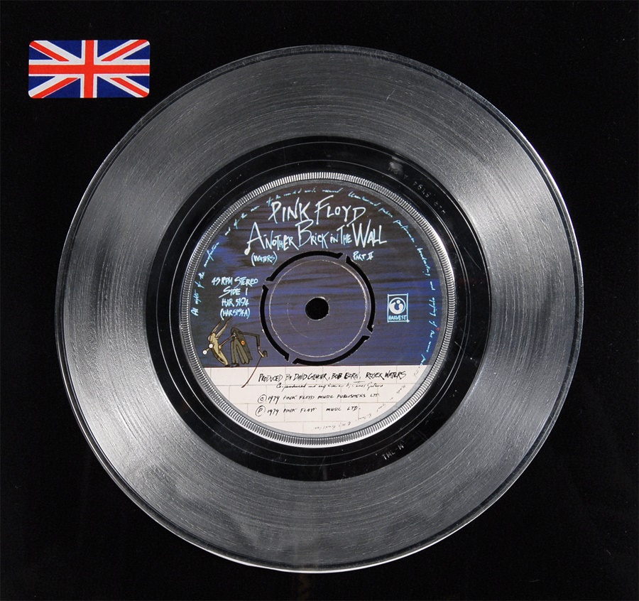 One of the biggest worldwide #1 smashes of the rock era, Pink Floyd's "Another Brick in the Wall" ushered in the '80s at the top of the charts in several countries, including their native England, from where this commemorative platinum single hails. The 45 features the distinctive, hand-drawn artwork from "The Wall" and is housed in a 9x12" frame on a black background. There is a Union Jack in the upper-left corner and a plaque below the record that reads: "PINK FLOYD "ANOTHER BRICK IN THE WALL" RECORDING FIRST PUBLISHED ON HARVEST RECORDS 1979." This is a handsome item that would look great on any "WALL" in your home or office!