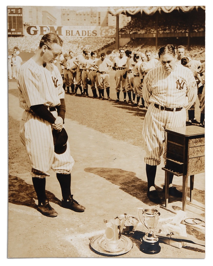 The definitive image of Lou Gehrig on Lou Gehrig Day - July 4, 1939 at Yankee Stadium. New York Times photographer Ben Greenhaus, who was working for Wide World Photo at the time, captured this heartbreaking moment, which includes an understandably deflated Joe McCarthy standing beside his teammate. This is a spectacular 10x13” print mounted on artist’s board to approximately 13x15” and is in EX+ condition. The photo was specially created for a photography contest that Greenhaus had entered. There were other pieces by him entered in the contest with similar mountings. In fact, this image is only seen as a lesser-quality wire photograph. A vintage, first-generation print from the original negative, the back is marked by the artist in pencil, “END OF THE ROAD - BEN GREENHAUS - WIDE WORLD PHOTO.” After proclaiming to the crowd that he considered himself "the luckiest man on the face of the earth," Gehrig died less than two years later. "Lou Gehrig Day" festivities took place between games of a Yankees-Senators doubleheader in The Bronx.