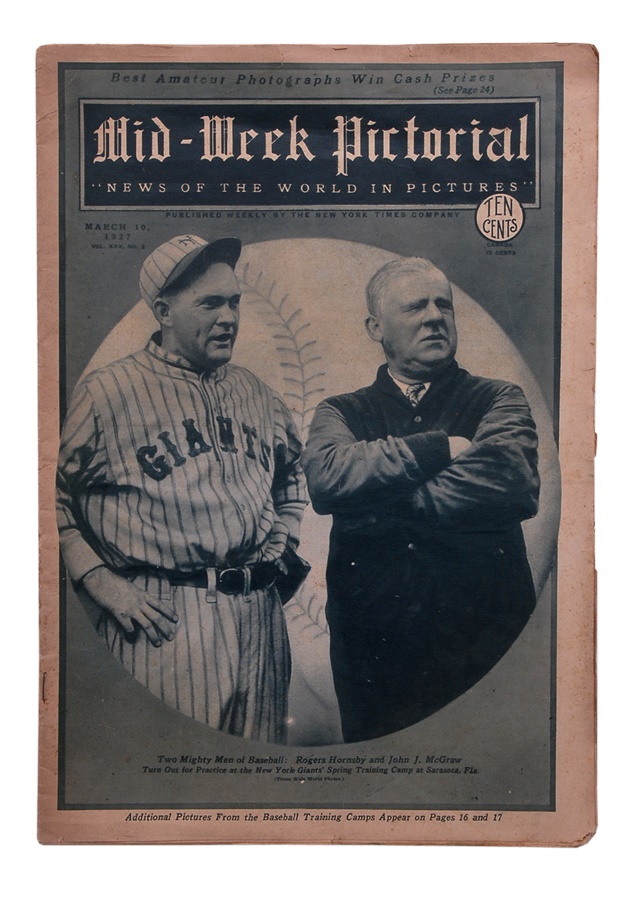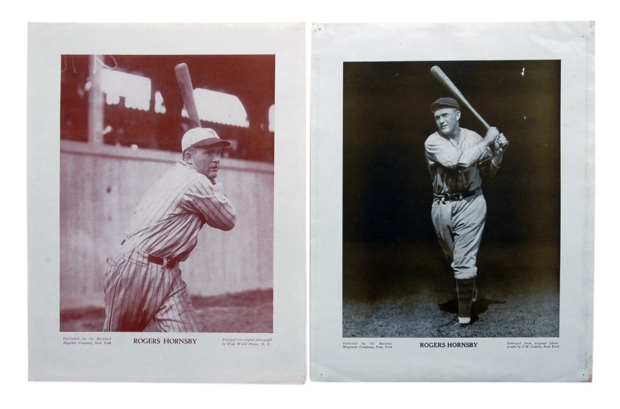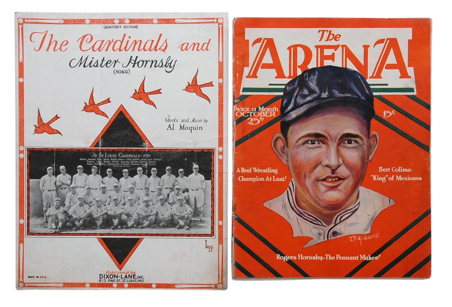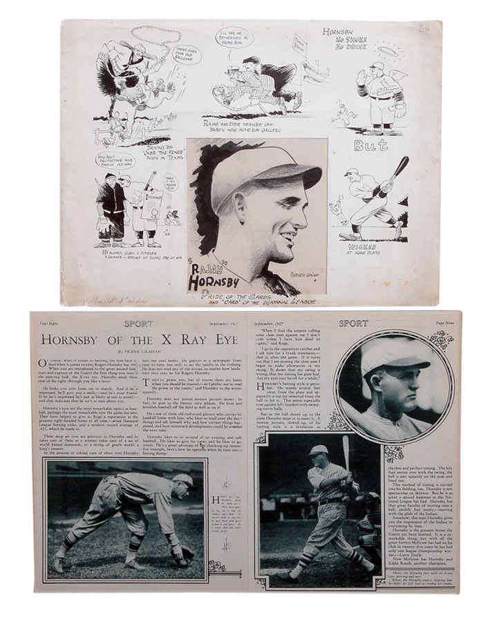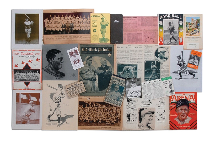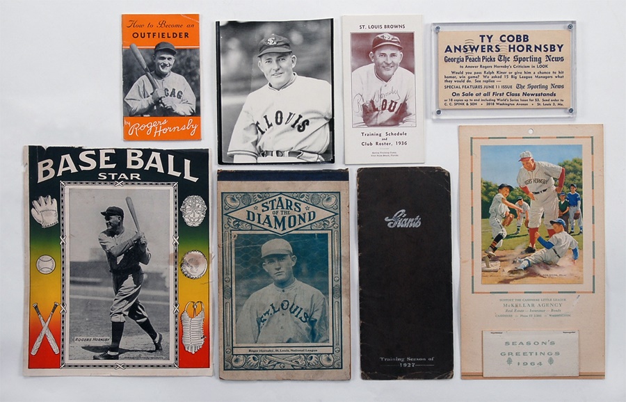 What a superb assemblage of baseball memorabilia! Included in this lot is a 1927 Giants roster, "The Cardinals & Mr. Hornsby" 1926 sheet music, 1952 Cobb-Hornsby Sporting News postcard, 1964 Hornsby calendar, unusual Giants-White Sox scorecard with fabulous Rogers Hornsby poem written on the reverse side, Baseball Star and Stars of the Diamond notebook covers, 1936 St. Louis Browns roster with Hornsby cover, 1951 Seattle Rainiers roster and program (Hornsby covers), original 1920s pen & ink by Christy Walsh when he was a cartoonist, great 1929 Cubs large supplement, original art and more. A total of 21 pieces that average VG-EX. Considered by many to be the greatest second baseman who ever lived, Hornsby's .358 lifetime batting average still ranks second all-time, behind only fellow immortal Ty Cobb.