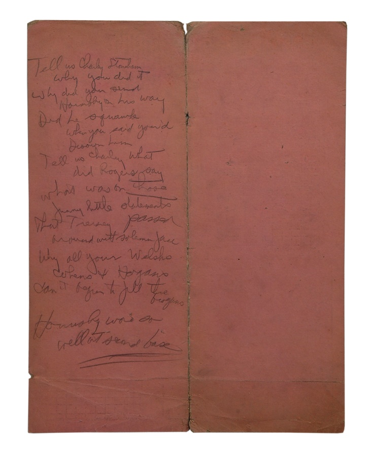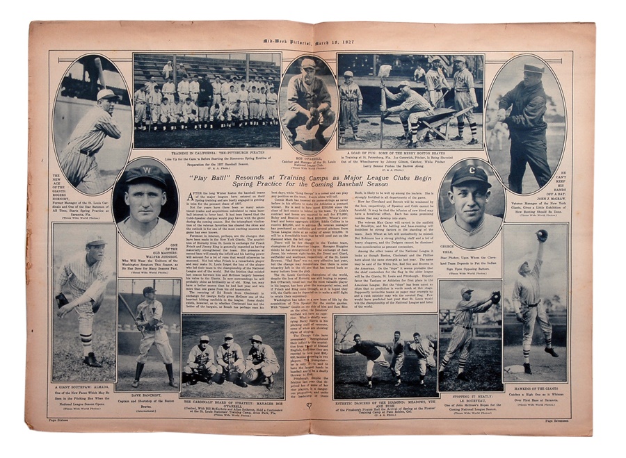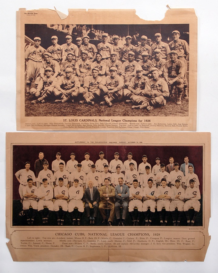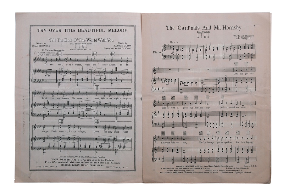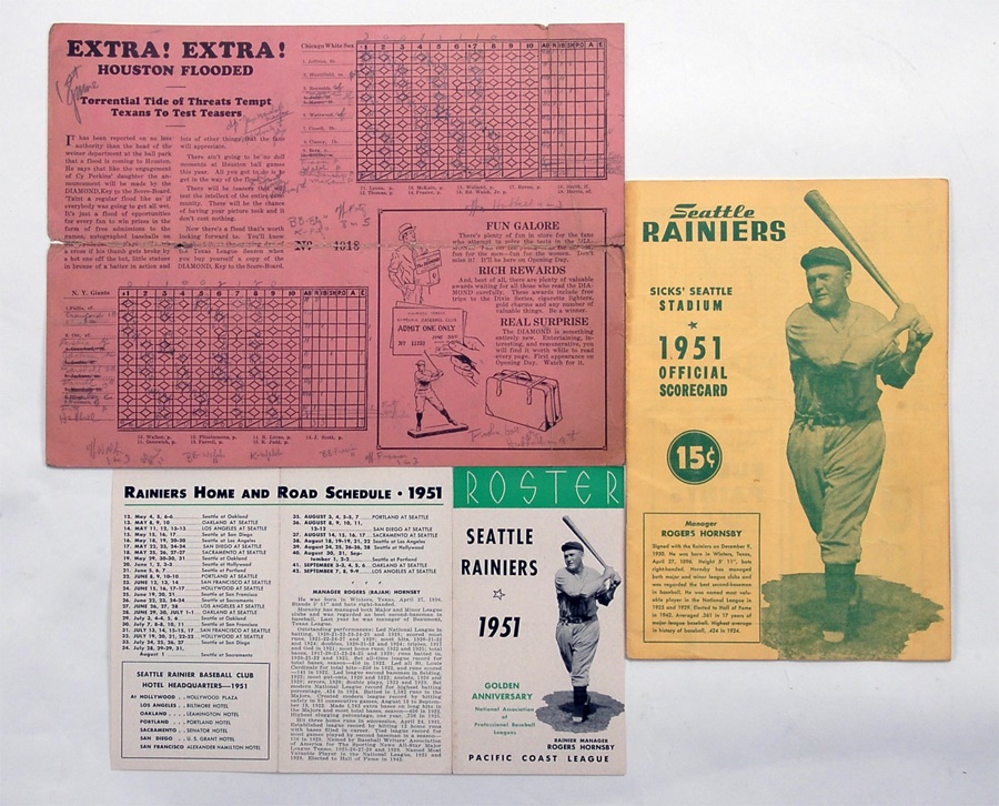 What a superb assemblage of baseball memorabilia! Included in this lot is a 1927 Giants roster, "The Cardinals & Mr. Hornsby" 1926 sheet music, 1952 Cobb-Hornsby Sporting News postcard, 1964 Hornsby calendar, unusual Giants-White Sox scorecard with fabulous Rogers Hornsby poem written on the reverse side, Baseball Star and Stars of the Diamond notebook covers, 1936 St. Louis Browns roster with Hornsby cover, 1951 Seattle Rainiers roster and program (Hornsby covers), original 1920s pen & ink by Christy Walsh when he was a cartoonist, great 1929 Cubs large supplement, original art and more. A total of 21 pieces that average VG-EX. Considered by many to be the greatest second baseman who ever lived, Hornsby's .358 lifetime batting average still ranks second all-time, behind only fellow immortal Ty Cobb.