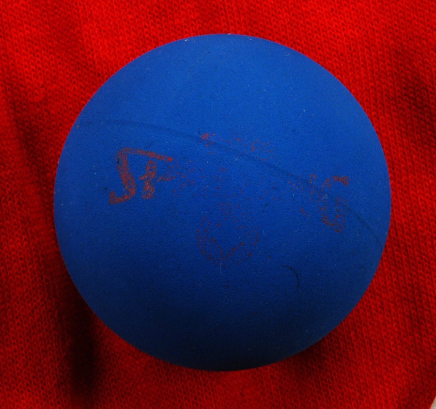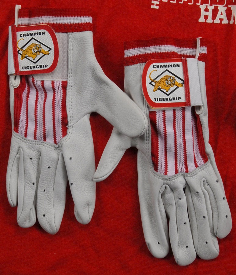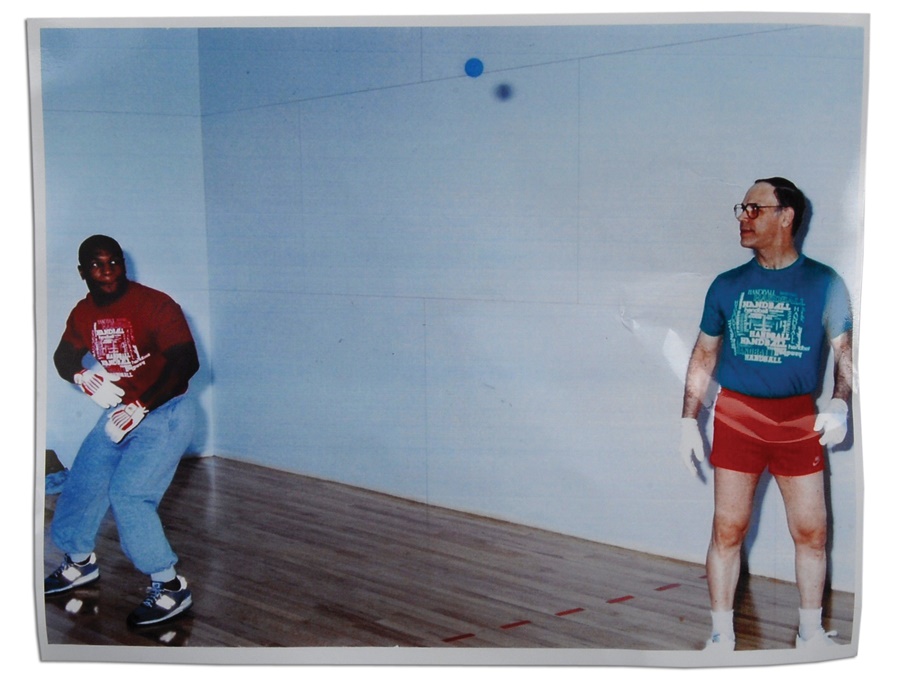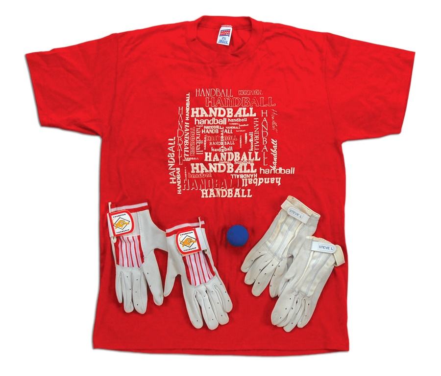 Mike Tyson's first professional manager Jimmy Jacobs is also remembered as the the greatest handball player who ever lived. Offered here is equipment used by Mike Tyson as he trained and played handball with the great Jimmy Jacobs. Includes: a blue handball used in their game; a red T-shirt with "Handball" logo, size XL; and two white and red Champion Tiger Grip handball gloves. Comes with a letter of authenticity from Tyson's early assistant manager Steve Lott and also with a photograph showing Tyson wearing the items.