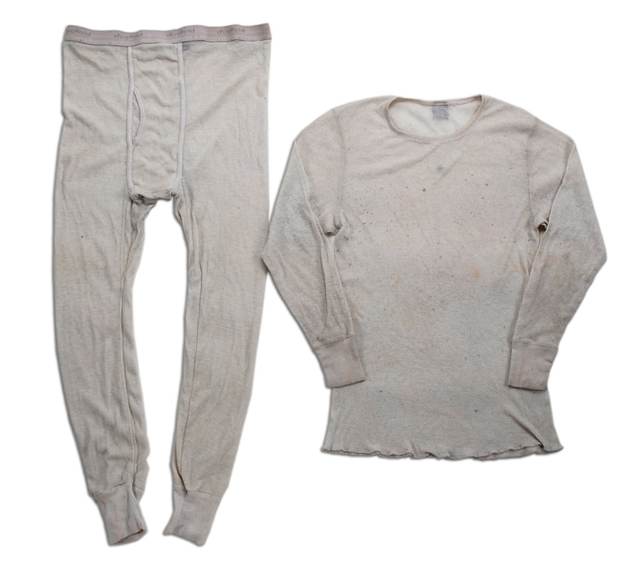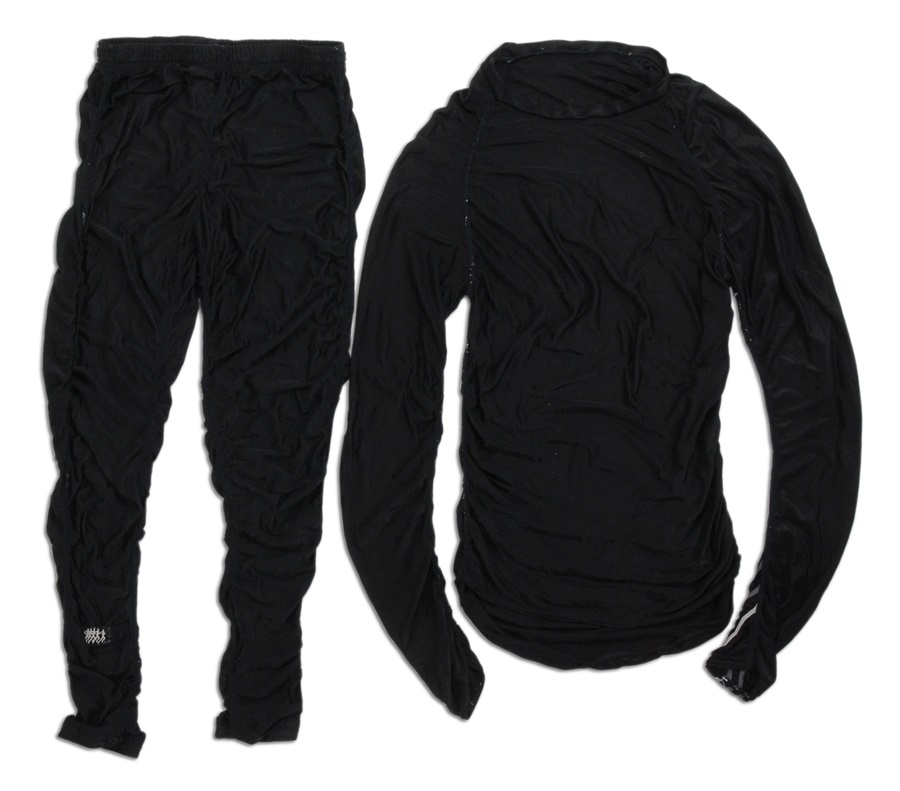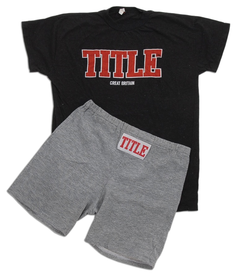 This is a group of six items used by Mike Tyson in preparation for his championship fight with former champion Larry Holmes on January 22, 1988. Includes: Gray training trunks with a manufacturer's label for Title; a black t-shirt with Title Great Britain on front, size large; thermal underwear training pants (size 38-40), and long sleeve shirt (XL); and two-piece black satin tights with long legs and long sleeves. Comes with a letter of authenticity from Tyson's early assistant manager Steve Lott and also with photographs showing Tyson wearing the items.