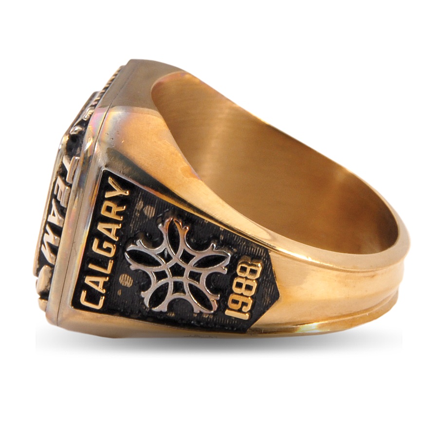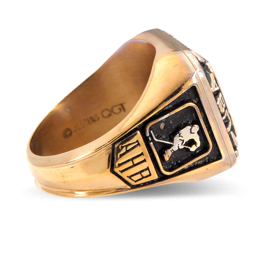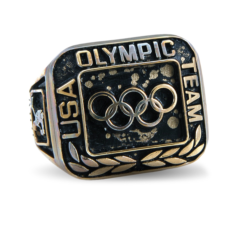 American hockey player Allen Bourbeau sported this sharp 1988 Team USA ring as a result of his participation at the Olympic Games in Calgary. The face of the ring reads: "USA OLYMPIC TEAM" and showcases the olympic logo in the center. One shank features the image of a skating hockey player and the initials AHB, while the other side reads: CALGARY 1988 surrounding a snowflake. The non-gold ring bears the Jostens stamp inside along with "QGT." The ring is in EX-MT condition and comes in its original box.