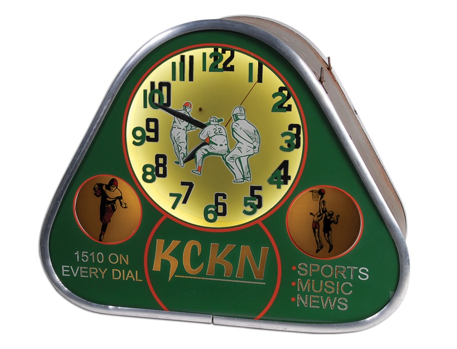What man-cave would be complete without this item? This sturdy clock - still in working condition - served as an advertisement for radio station KCKN. The triangular timepiece measures 23x19x10" and has a display on both sides. The clear plastic over the clock face features an illustration of a batter, catcher and umpire, as well as illustrations of football and basketball action in the bottom corners. The KCKN logo is bottom center, and on the bottom left (below the football player) it reads "1510 on every dial," while the bottom right (below the basketball players) reads, "Sports - Music - News." There are some small rust spots around the metal frame but the clock sports the original glass face on both sides and is in working order.