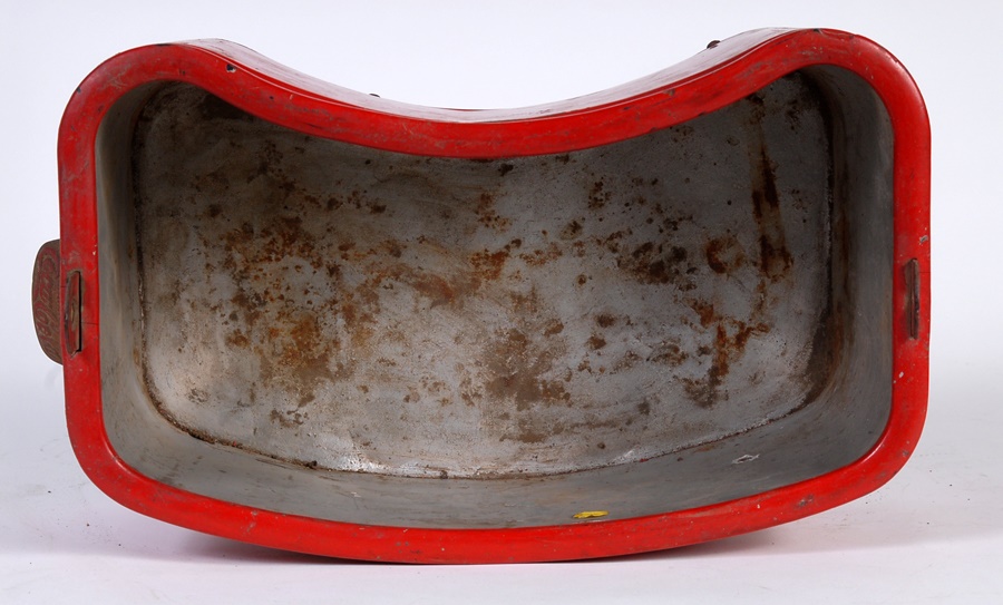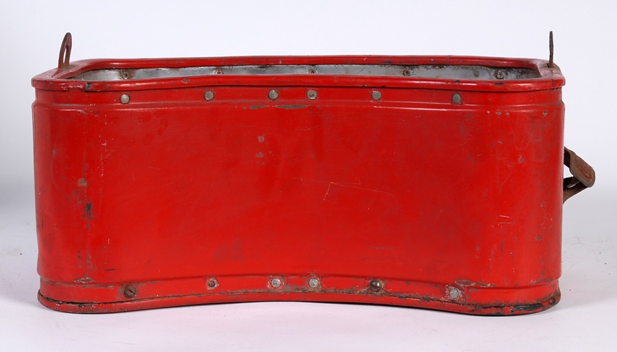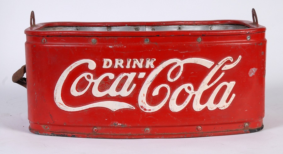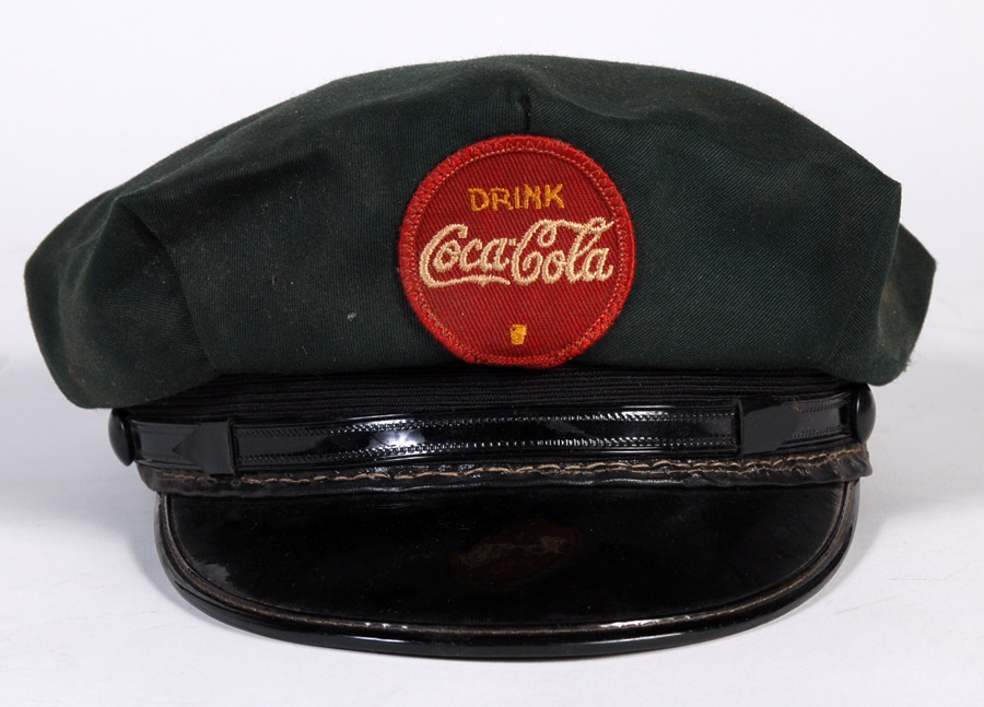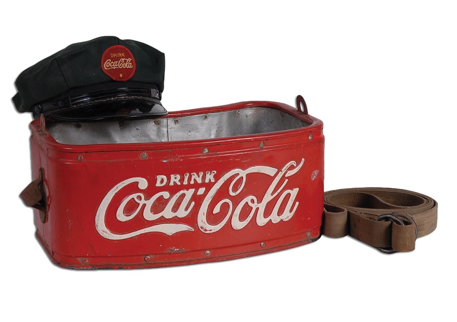 Stadium vendors used to haul their wares around in amazing strap-on coolers such as this back in the 1930s. This 16x7" red insulated metal dispenser comes with cloth strap that attaches to loops on either side. There is also a bottle opener with Coca-Cola emblem on the left side. and green hat with black vinyl bill and red patch urging fans to "Drink Coca-Cola," the same message seen on the front of the cooler.