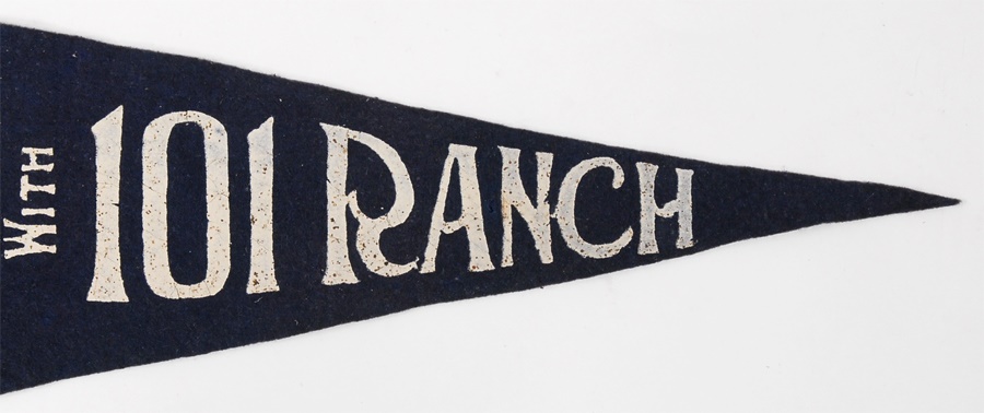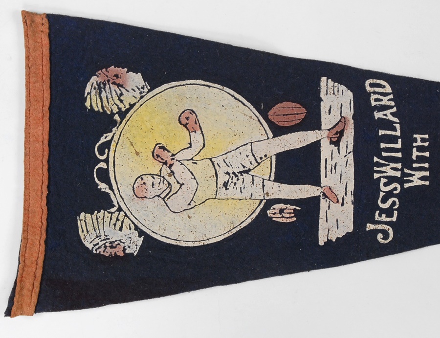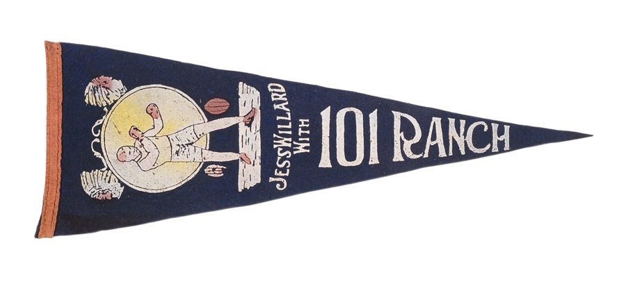 This is a circa 1915 blue and gold felt pennant picturing then World Heavyweight Champion Jess Willard with Indian heads above him. This was a souvenir pennant for Willard's appearances at the then-famous 101 Ranch rodeo show. The pennant is 29.5 inches long and exhibits some surface wear and soiling. The color and image remain bold. Extremely scarce offering.