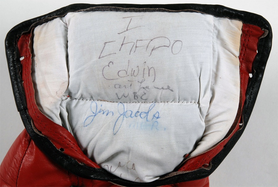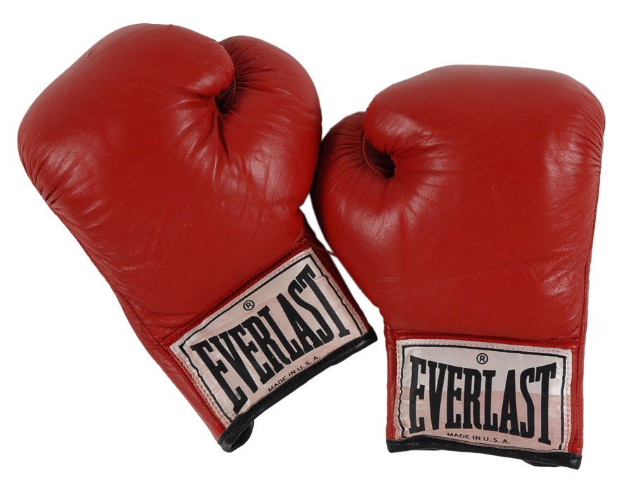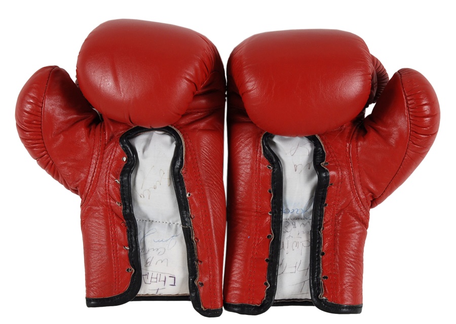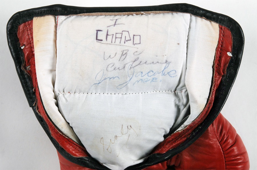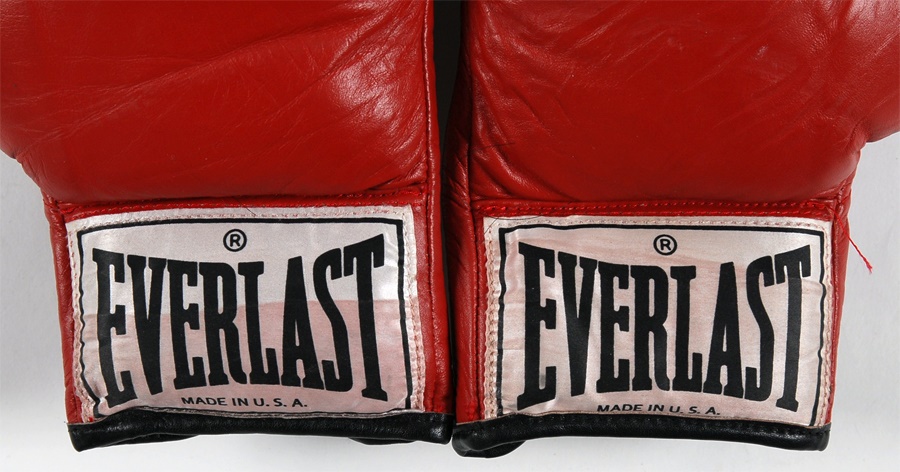 On November 21, 1987 at the Las Vegas Hilton in Las Vegas, World Lightweight Champion Edwin "Chapo" Rosario defended his title against the great Julio Cesar Chavez. In an incredibly hard-fought and exciting match Chavez prevailed, winning by TKO in round eleven. Offered here are the actual fight worn gloves used by Edwin Rosario in this match. The gloves are red leather, eight ounce, Everlast gloves which have been marked inside by Jimmy Jacobs, Rosario's then-manager. Perfectly intact. A rare offering from this great champion. Comes with a letter of authenticity from Steve Lott (who worked with Jacobs) who took possession of the gloves immediately after the fight and with a video of the fight showing Rosario using the gloves while in the ring.