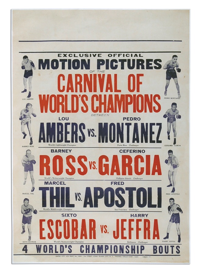 On September 23, 1937 at the Polo Grounds in New York, history was made when four championship bouts were featured on one fight show entitled the Carnival of Champions. Barney Ross defended his Welterweight Title defeating Ceferino Garcia in 15 rounds by decision. Lou Ambers retained his Lightweight Title defeating Pedro Montanez by 15 round decision. Marcel Thil lost his Middleweight Title when he was stopped by Fred Apostoli in 10 rounds. Harry Jeffra won a 15 round decision and the Bantamweight Title defeating Sixto Escobar. All eight great fighters on one card. Offered here is an exceptionally rare fight film poster for this epic boxing event. The poster is paper and has been professionally linen backed. Light restoration at folds. EX.