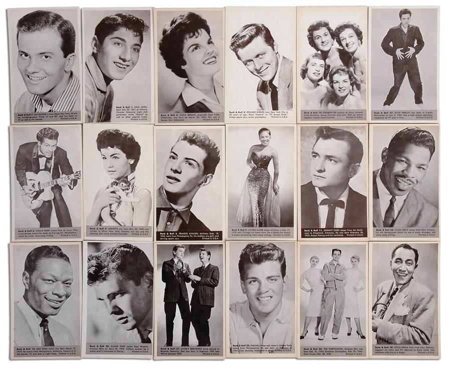 Rock n Roll will never die, but now you can own a piece of its infancy. This is a complete set of all 64 cards and averages NMMT. The cards measure approximately 3.5x5.5" and feature a black and white photo of the subjects, along with a card number and brief biography. The back is blank and while there is minor age discoloration, the corners are all nicely intact and there are no markings or blemishes visible on any of the cards. Key cards include Elvis NMMMT and centered, Johnny Cash NRMT, and Frank Sinatra NRMT, along with the likes of Paul Anka, Perry Como, and Chuck Berry (misspelled "Chuck Perry"). Comes with an original 5-cent display box VG.