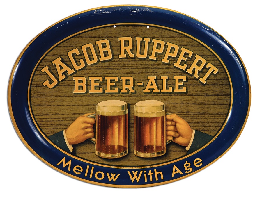 A vintage piece of memorabilia from the late 1930s, this metal sign advertises the brewery owned by Jacob Ruppert whose name is also synonymous with the ownership of the New York Yankees. The 15.5x11.5" oval sign shows two dawn fists hoisting mugs of beer with the wording: "JACOB RUPPERT BEER-ALE - MELLOW WITH AGE." There are a few scratches evident but the item is in EX condition overall. Ruppert inherited the brewery from his father and also served four consecutive terms in congress.