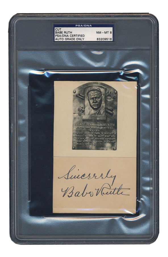 Nearly a century after his major league debut in 1914 - and over six decades since his passing in 1948 - few figures remain in the American iconography like one George Herman "Babe" Ruth. Yes, many of the stories of his off-field "exploits" were true, and no, the candy bar wasn't named after him. But there is no denying the ability of the man who was named by the Associated Press as not just the Baseball Player, but the "Athlete-of-the-Century." This item is a 4x6" index card, with the blank side featuring an image of The Bambino's plaque from the Baseball Hall of Fame, placed above his signature on the blank side. The signature, in Ruth's crystal-clear penmanship in blue ink says "Sincerely Babe Ruth." It is PSA/DNA Certified, NM-MT 8. To this day, The Babe remains among the all-time elite in many offensive statistical categories, including home runs (3rd), batting average (10th), runs batted in (2nd), runs scored (4th), and walks (3rd).