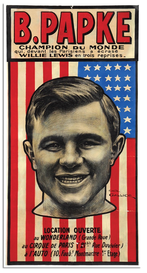 This is a magnificent French advertising poster for the fight between Billy Papke and Willie Lewis at Cirque de Paris in Paris, France on March 19, 1910. Papke knocked Lewis out in the third round and, thinking Stanley Ketchel had relinquished the middleweight title, Papke claimed it after his victory. The poster pictures Papke and features an excellent likeness, bold color and vivid image by artist Emile Gallice. 29.5x60" on linen, some minor chipping. Exceptionally rare.