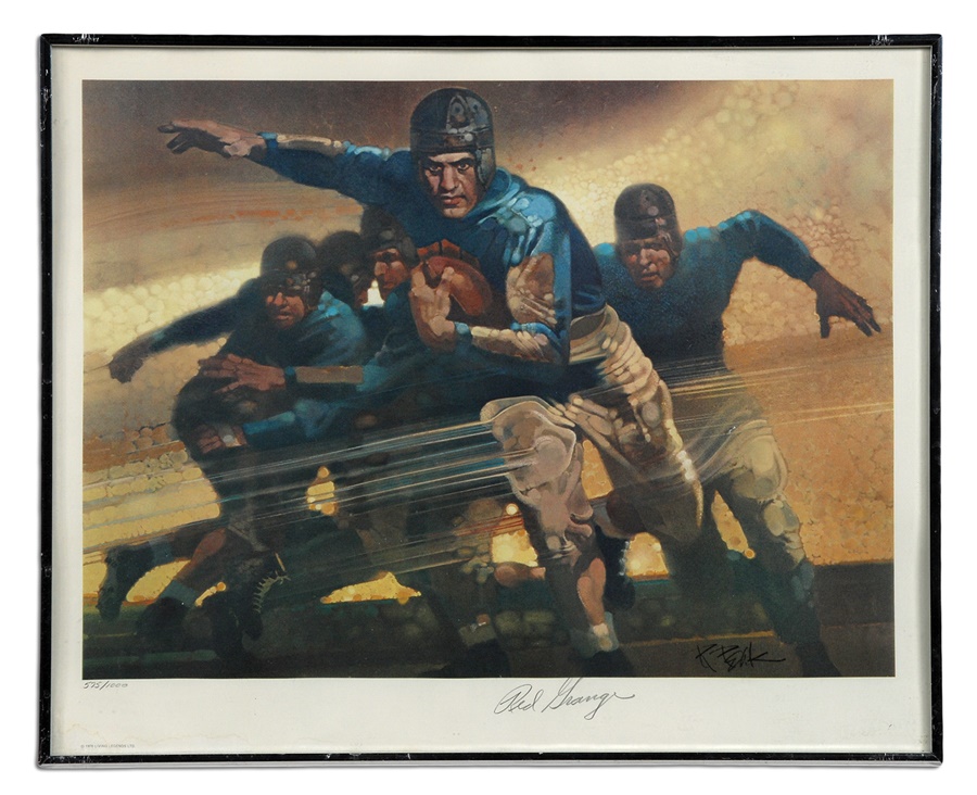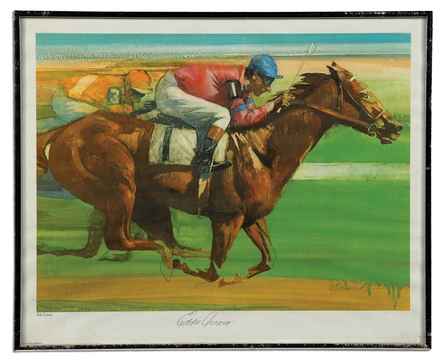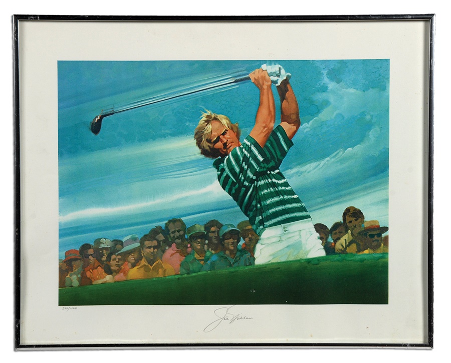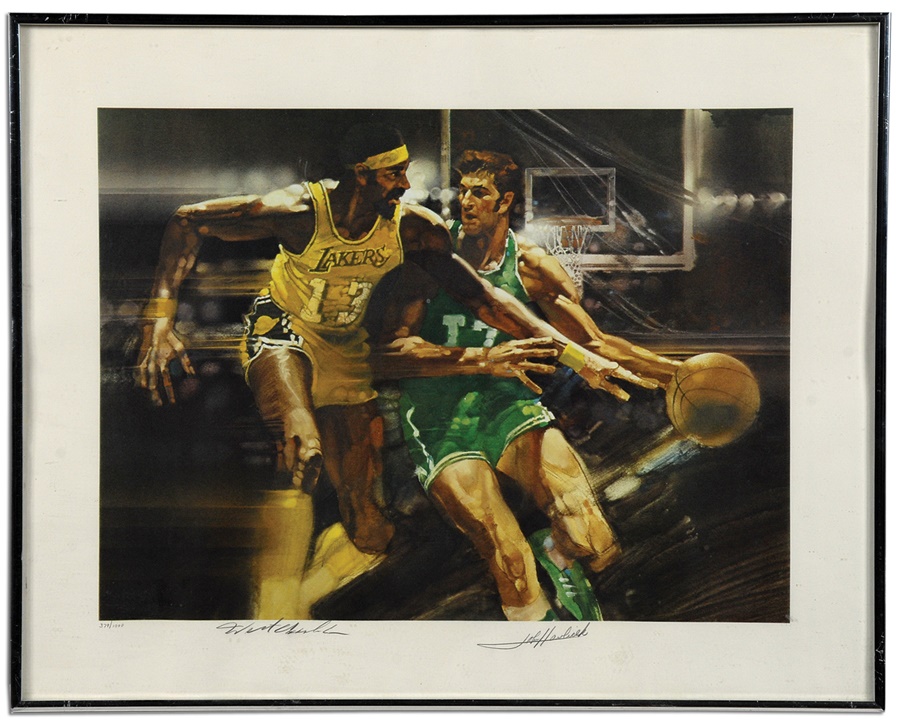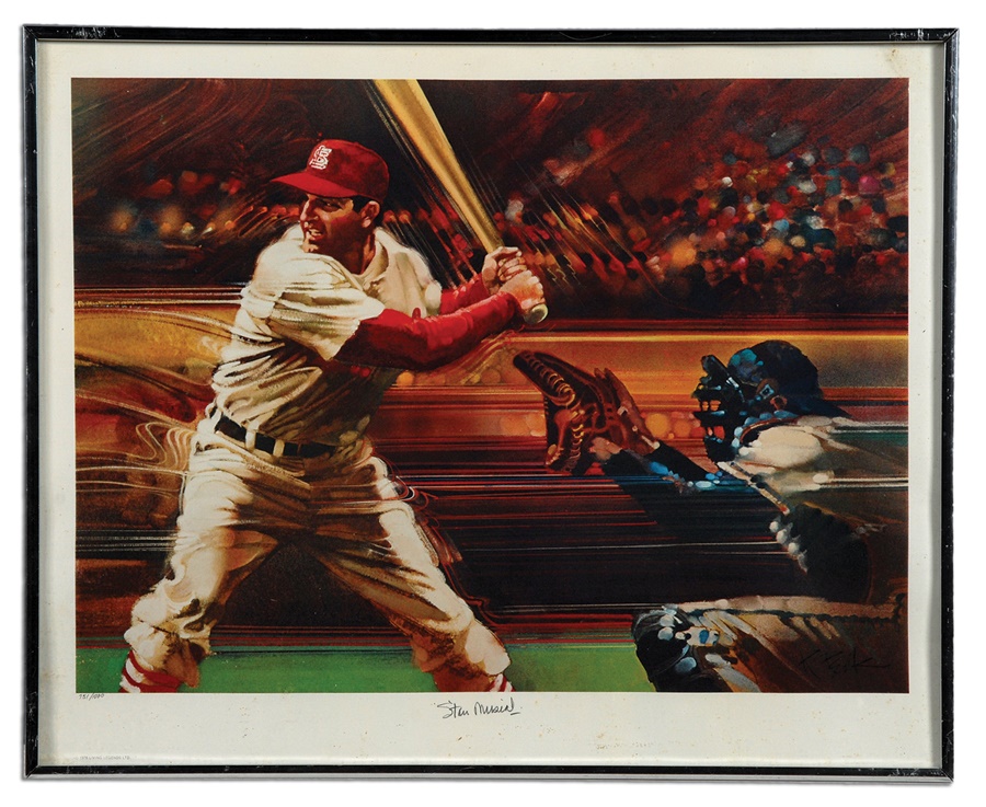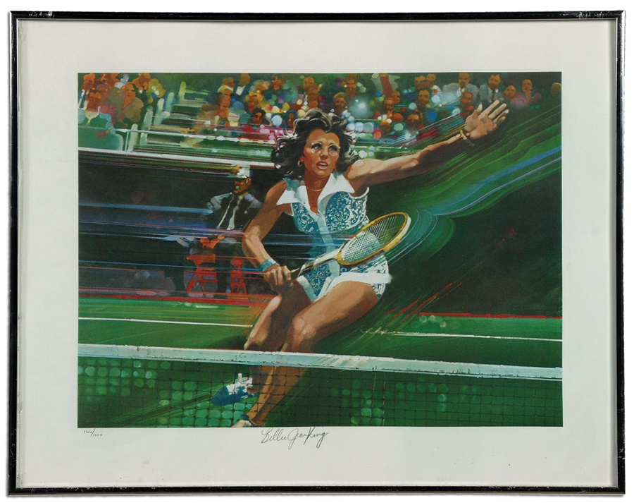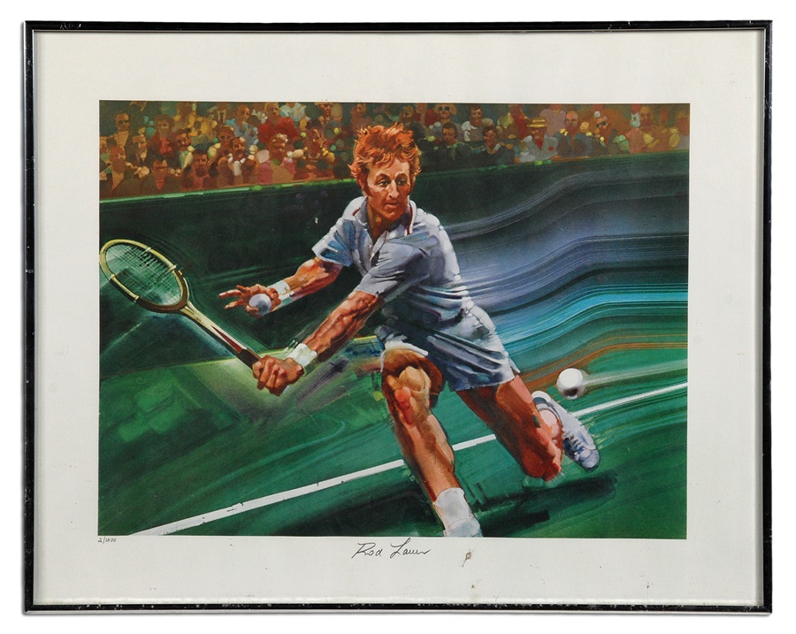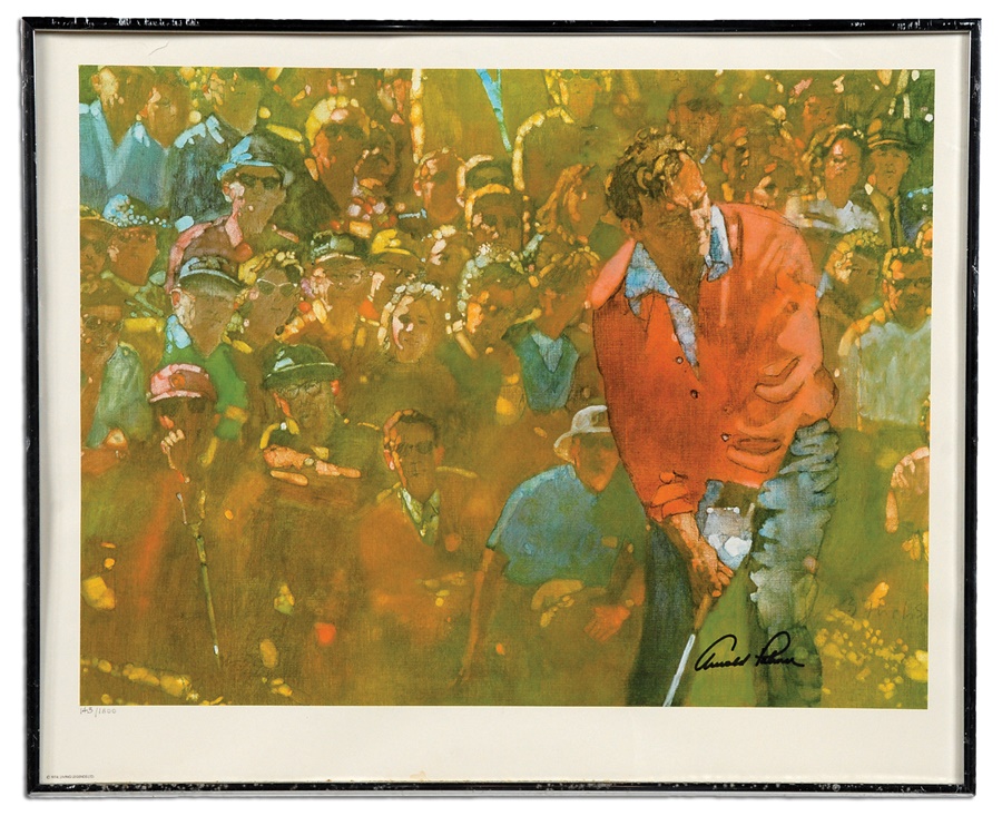 This lot contains a batch of eight serigraphs from the Sports Illustrated Living Legends collection. Included are portraits of: (Arnold Palmer, #143/1600); Eddie Arcaro (#26/1500); Wilt Chamberlain and John Havlicek (#379/1000); Rod Laver (#2/1000); Jack Nicklaus (#882/1000); Billie Jean King (#166/1000); Red Granger (#357/1000); and Stan Musial (#751/1000). The average condition of these works is Excellent while all signatures are in pencil (but for Palmer who is in felt tip pen) and rate at least 7/10. They come in a variety of sizes, generally between 22x18" and 25x22." A nice selection of artwork portraying top athletes across several decades.