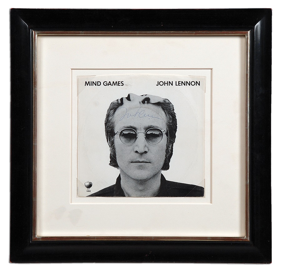Contains a 45 rpm picture sleeve signed by John Lennon. This is an art piece in that he has purposely signed it on his forehead to represent his “mind.” In archival frame, also holding the original apple disk. Signed in person for Christopher Lewe who met John Lennon by acting as an unofficial bodyguard for him on May 16, 1975, during Lennon's visit to the TVG Radio Studios WPVI/WFIL to participate in the "Helping Hand Marathon." The September 2002 issue of Maxim Bender Music magazine features a photo of Mr. Lewe with John from the event. Signed in blue ink by Lennon. The lot includes an autographed letter signed by Lewe, recounting his meeting with Lennon.