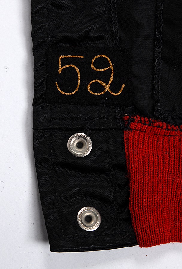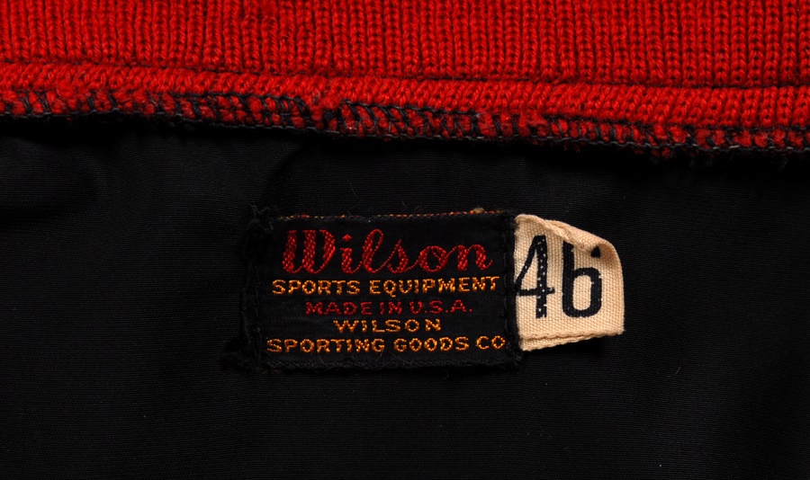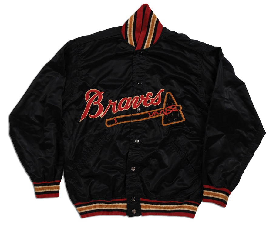 The Braves spent their last season in Boston in 1952 before departing for Milwaukee, and this all-original, black satin player's jacket has the familiar "Braves" script and tomahawk logo across the front. The number "52" is sewn on a felt swatch inside the front tail, and there is Wilson size 46 tagging in the collar. The name of the player who wore the jacket is not identified. There is evidence of use but overall is still in nice condition.